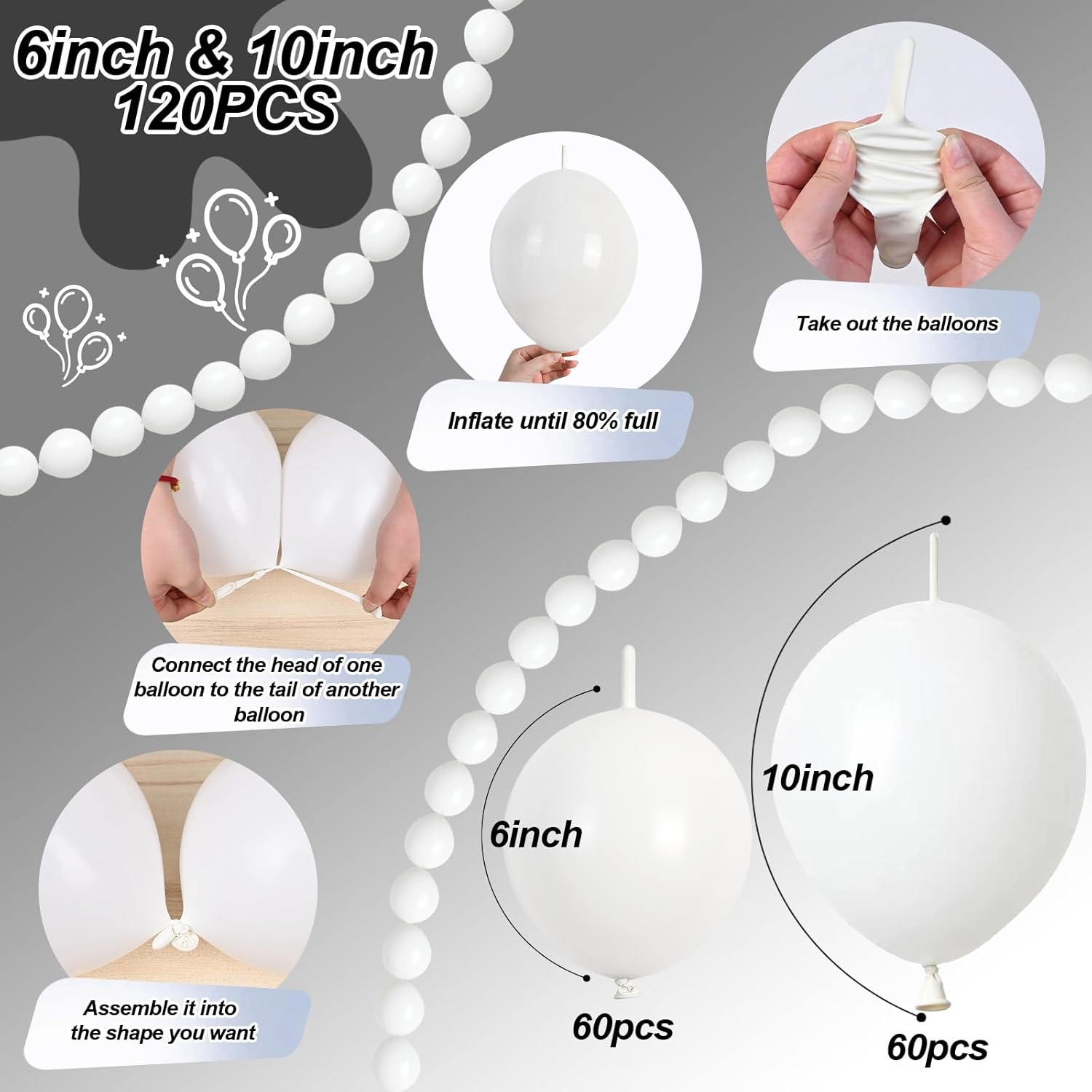 - ๐ซBalloon Chain Garland - You will receive 120 pcs white link balloons, include 10inch*60pcs + 6inch*60pcs. Our quick link balloons have a unique tail design that allows balloons link to be easily. More convenient and easier to assemble than regular balloons.