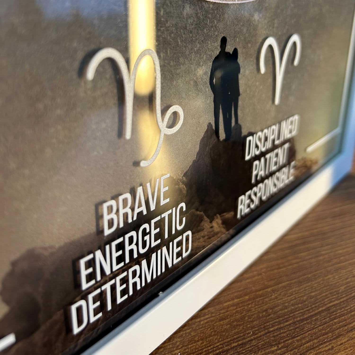 Personalized Unique Couples Zodiac Sign with Framed Glass, Custom Zodiac Gifts for Couples, Meaningful Gift for Anniversary, Engagement, or Wedding, Couples Zodiac Plaque