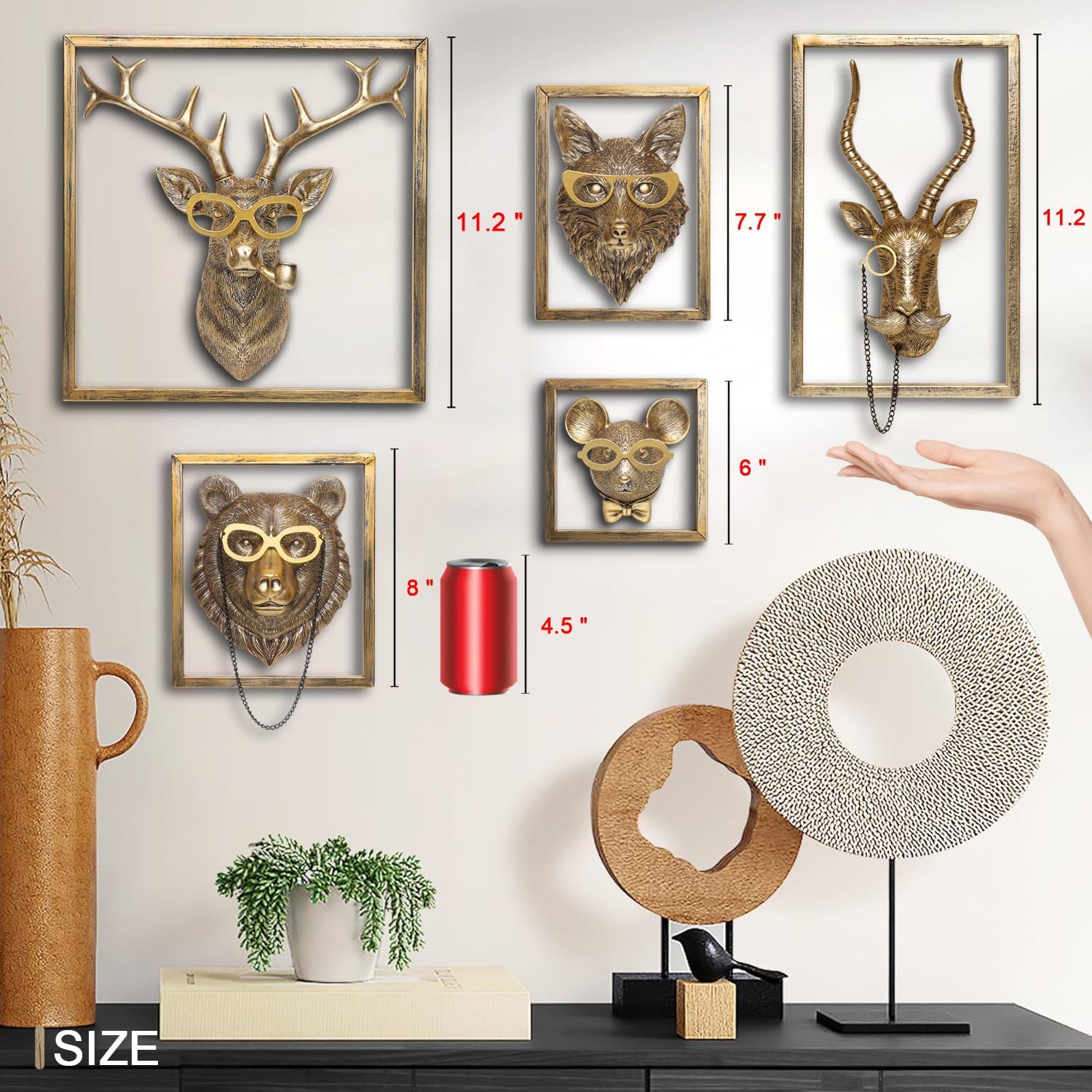 Animal Heads Wall Decor (5pcs, Includes Metal Frame) Resin Animals Sculptures Head Wall Hanging Decoration Gold vintage Wall Sculpture for Living Room Bedroom Office
