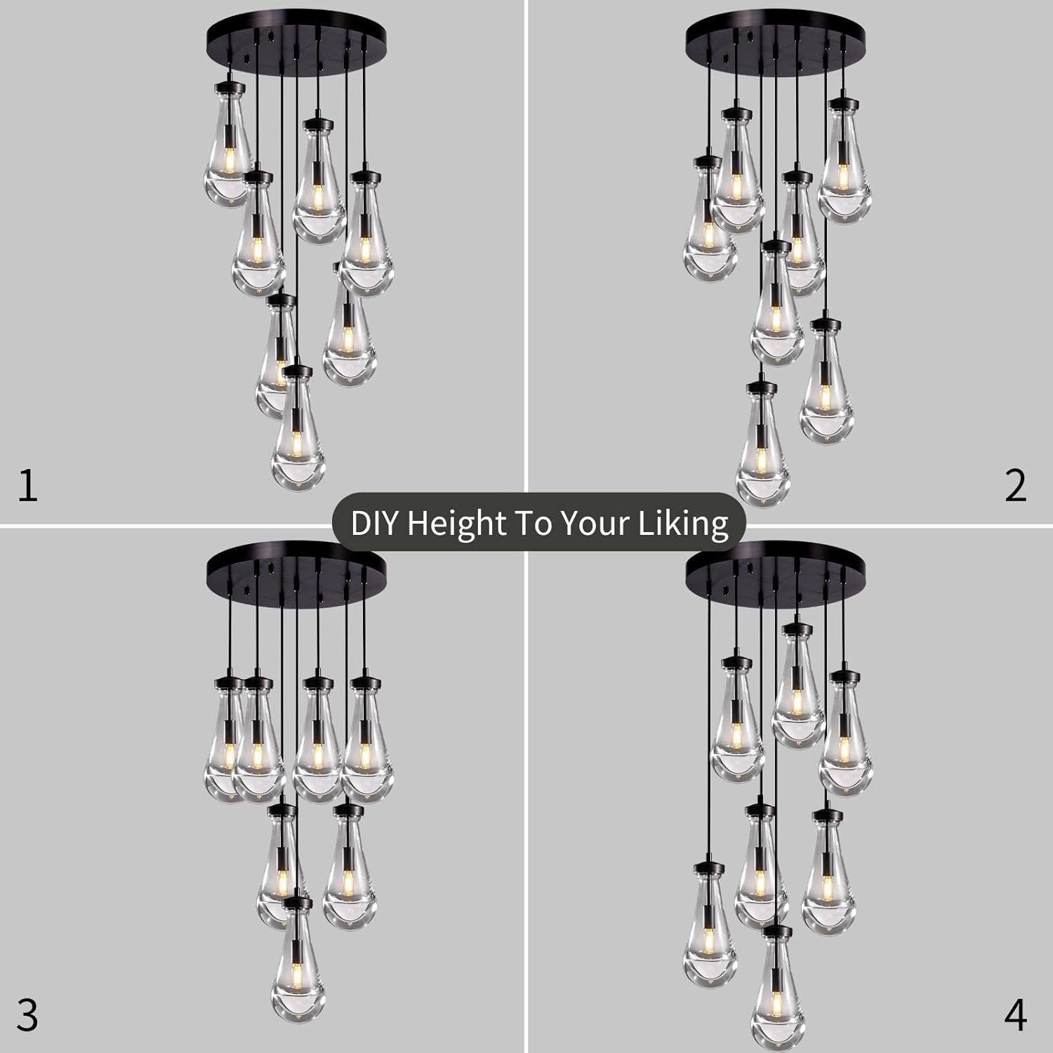 - 【DIY Your Preferred Height】Morden 7-light black raindrop pendant lighting features an adjustable hanging rope. You can freely adjust the hanging rope length according to the height of the ceiling in your home to achieve the effect you want. The total length of the hanging rope is 100". the total weight of the raindrop cluster pendant lights kitchen island is 55 lb, and each raindrop shade can weigh up to 7 lb.