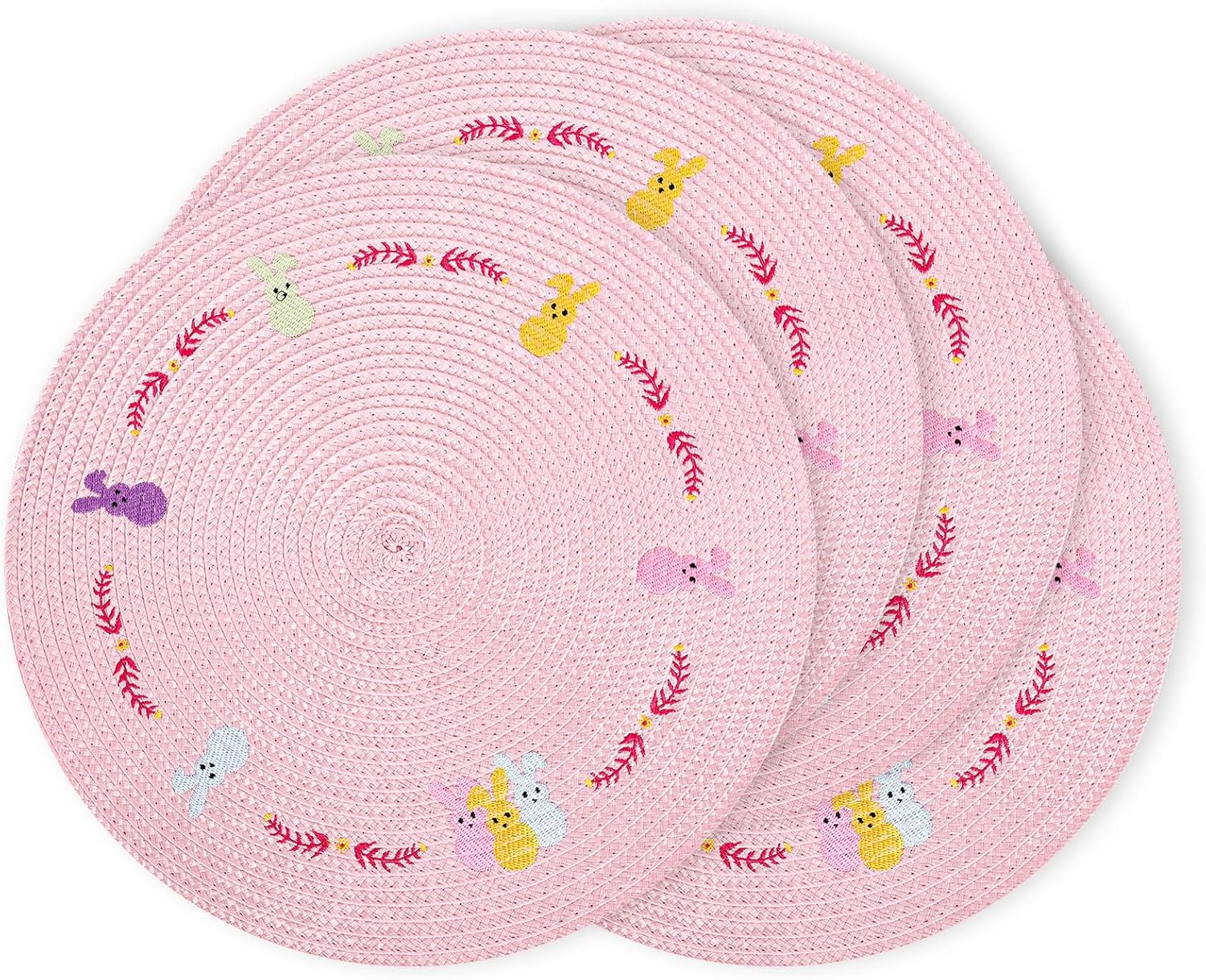 Whaline 4Pcs Round Bunny Easter Placemats Pink Rabbit Embroidered Place Mats Spring Cute Rabbit Dinner Table Mat Easter Dining Kitchen Table Mats for Home Wedding Baby Shower Birthday Party Decor