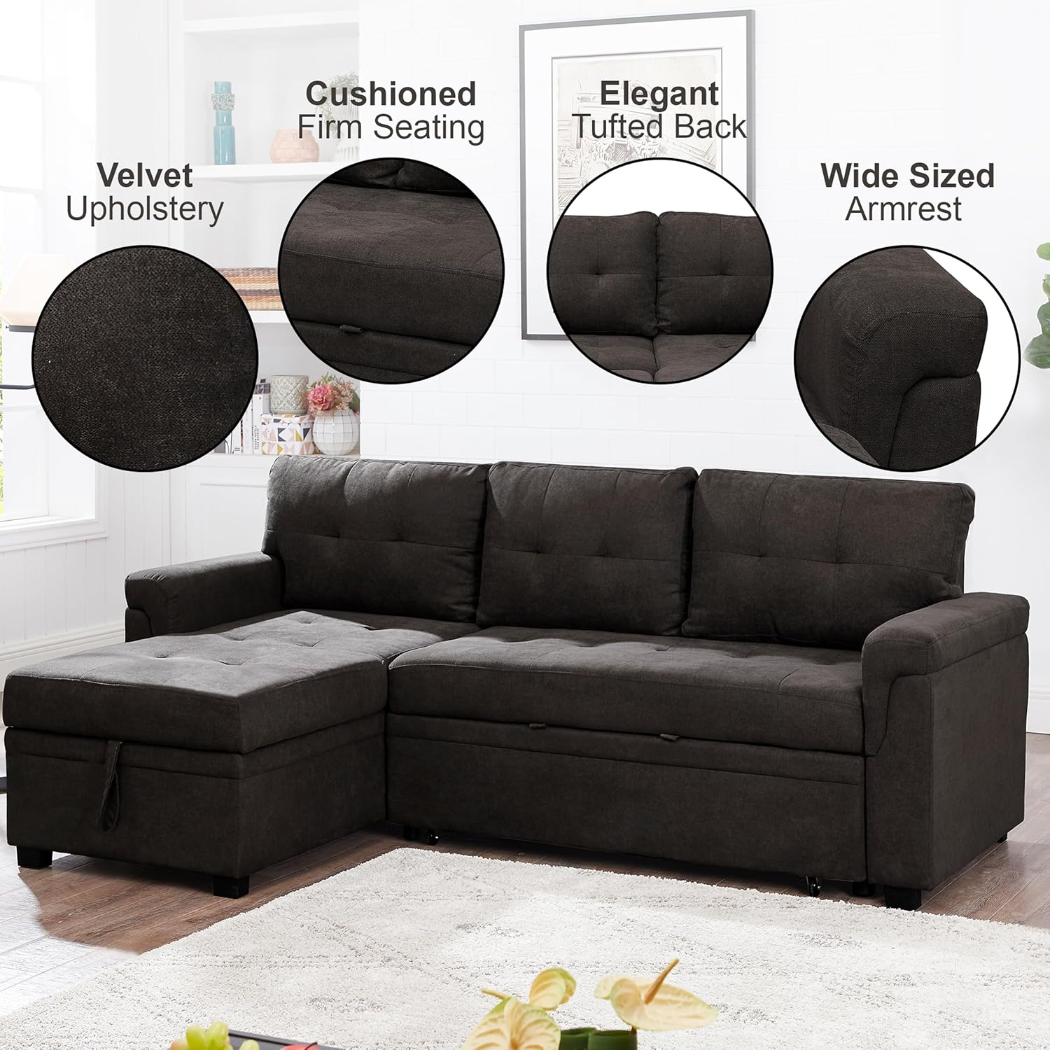 Naomi Home Transform Any Space: Sleeper Sectional Sofa with Convertible Sofa Bed & Inviting Chaise. Find Tranquil Comfort with Stress-Relieving Design & Durable Cushions - Espresso/Velvet