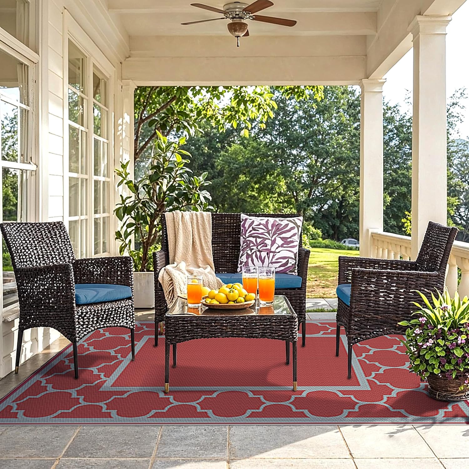 - Versatile Settings:Upgraded polypropylene ensures breathability and fast drying in this outdoor rug waterproof design. Perfect for the patio, deck, backyard, garden, porch, beach, RV, picnic, or camping. Elevate your outdoor experience with GENIMO—whether you're furnishing a peaceful retreat with pamapic outdoor furniture or outfitting your weekend getaway with stylish rv essentials.Also great as fall outdoor decor or a key element in your fall decor transformation
