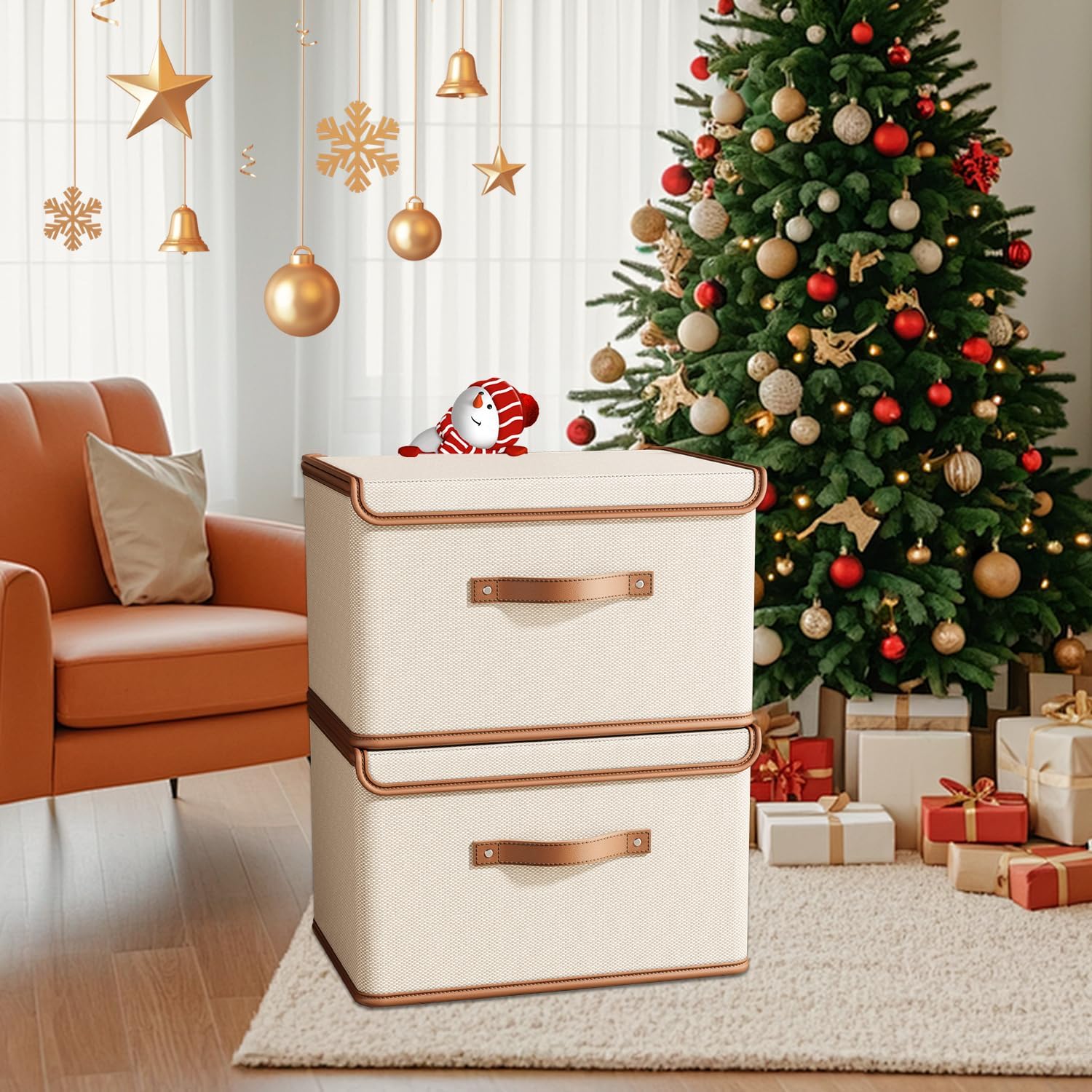 Tuza 2 Pack Storage Bins with Lids, Collapsible Closet Organizer Container, Fabric Organizer Box with Handles, Decorative Storage Boxes with Lids for Organizing Clothes, Blanket, White, Extra Large
