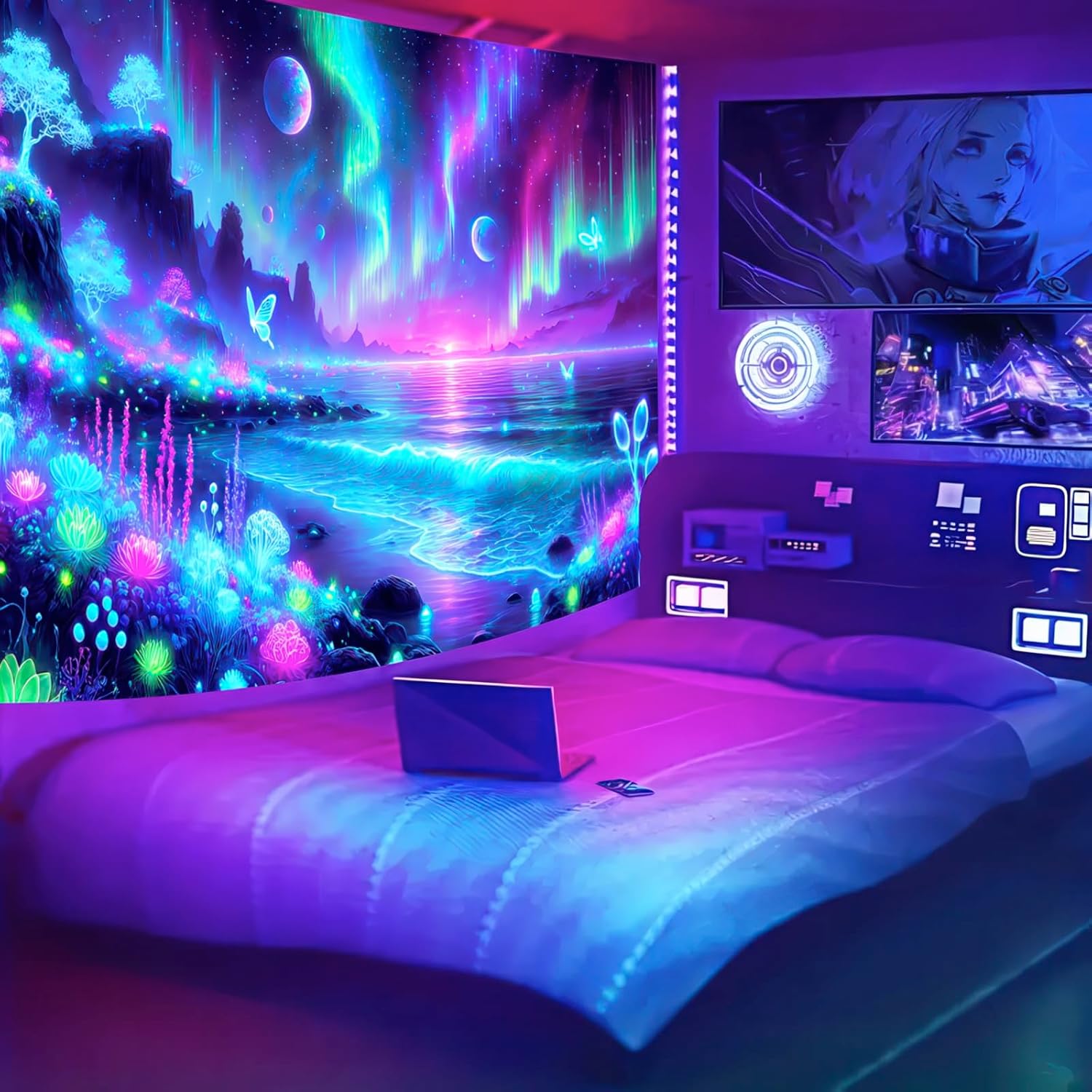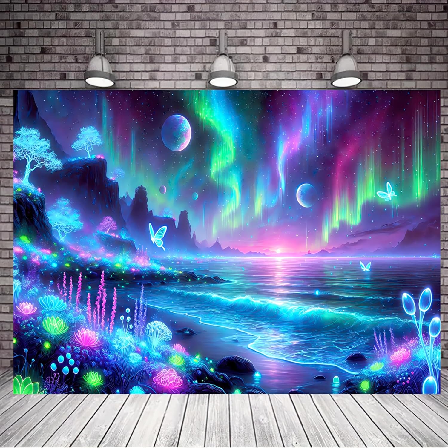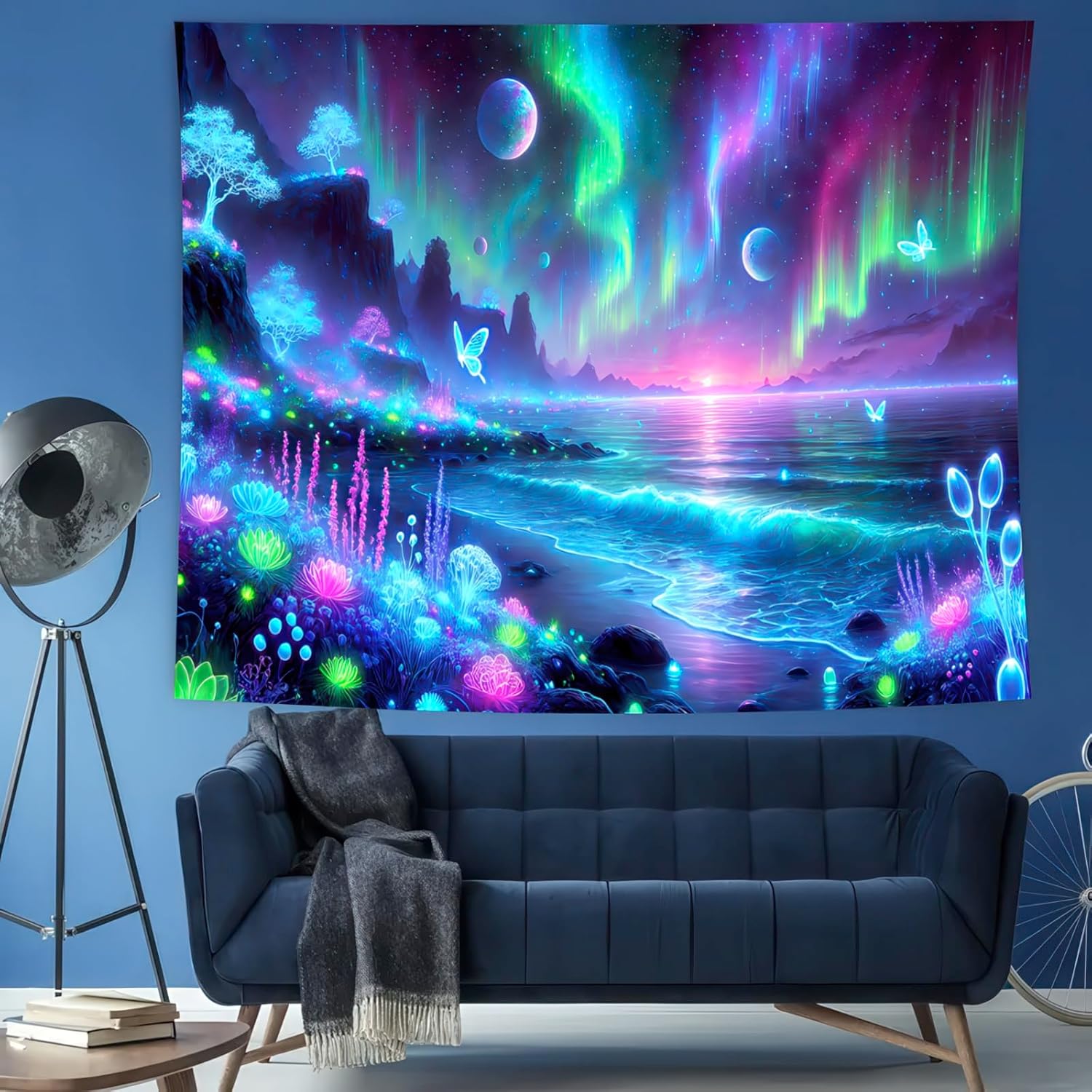 - UV/Blacklight Reactive: This Fantasy Forest Tapestry features intricate patterns of butterflies, mushrooms, the Milky Way, the moon, and stars. Under normal lighting, it is already a beautiful, vibrant piece. When exposed to blacklight or UV light, the butterflies and plants come to life, glowing brightly and creating a mesmerizing, magical effect in the dark.