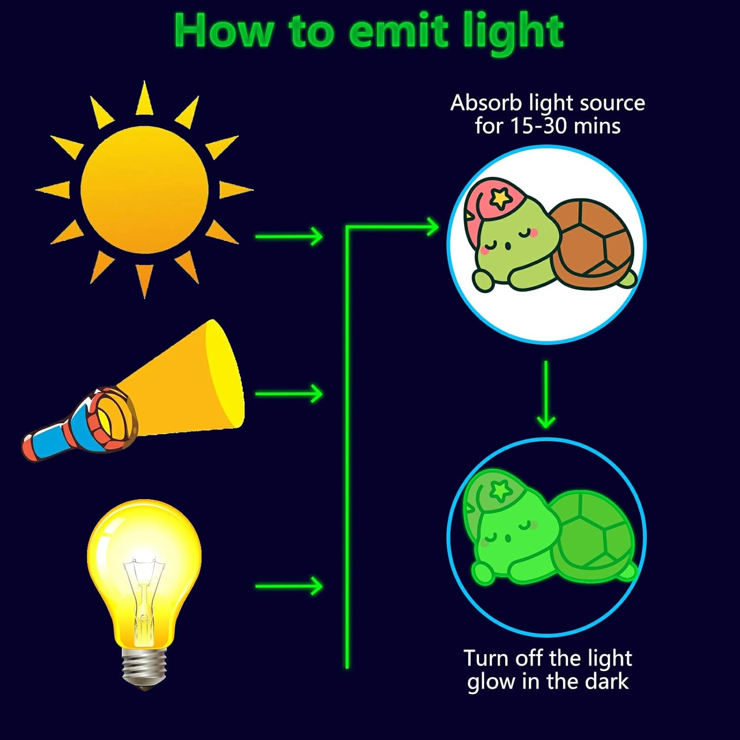 - ✦ Glow Turtles Wall Decals: These glow wall decals for ceiling are made of quality luminous material,they will glow brightly when absorb enough light during the day. You just need to put it under lamplight flashlight ,room light or sunshine for 15 minutes, it will keep glowing for 8-10 hours with a gentle green fluorescent light. Please ensure the light shines on the decals without obstruction, the longer it takes to absorb light, then to light up for up to longer.