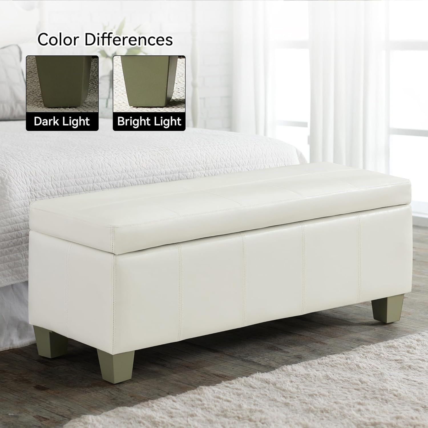 51" Faux Leather Storage Ottoman, Stitch Tufted Rectangle Upholstered End of Bed Storage Bench, Entryway Large Couch Ottoman with Wooden Legs,White