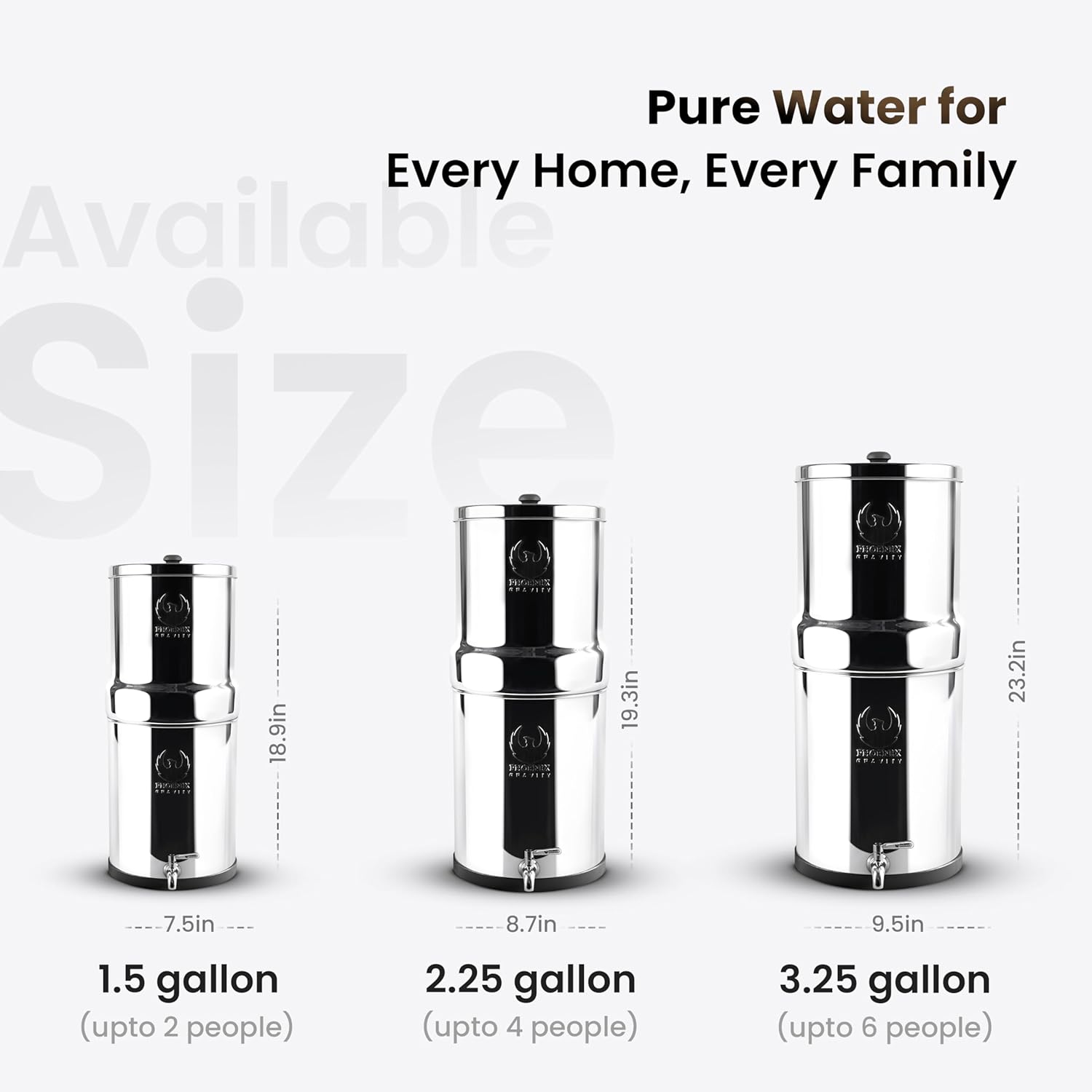 Gravity Water Filter System 2.25 Gallons NSF Certified - AISI 304 Stainless Steel Countertop Water Filtration with 2 Smart (Black) Carbon Filter Elements & Stainless Steel Water Spigot