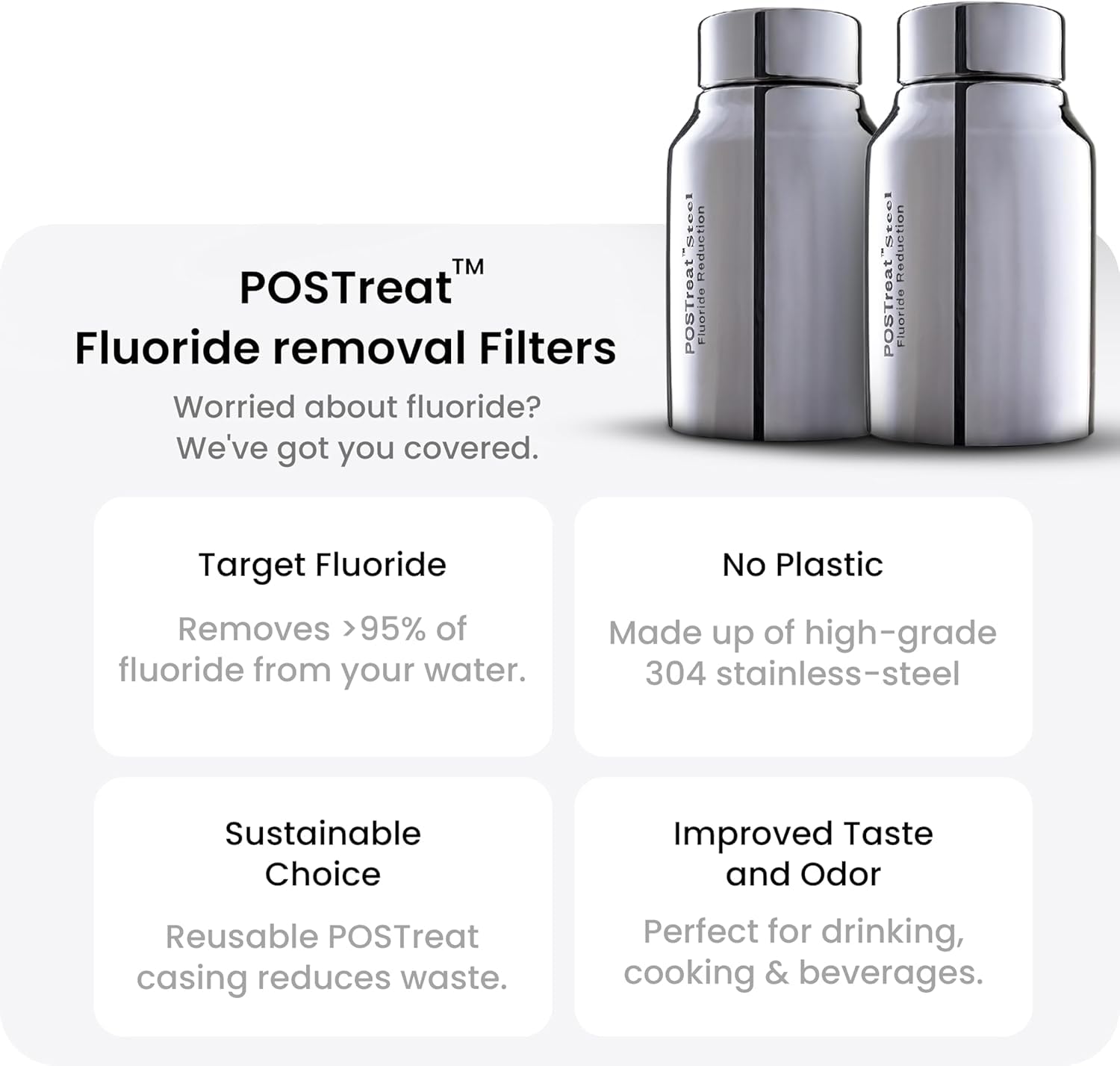 - 𝐅𝐥𝐮𝐨𝐫𝐢𝐝𝐞-𝐅𝐫𝐞𝐞 𝐖𝐚𝐭𝐞𝐫 - The postreat steel fluoride reduction filter elements made from AISI 304 stainless steel is built to last up to 10 years. The flourid media inside these filter elements removes over 95% of fluoride from your drinking water, delivering an added layer of protection for your family’s health. Our postreat steel flourid refill media last up to 1060 gallons or lasts up to 4 months, the flourid media should be replaced every 4 months.