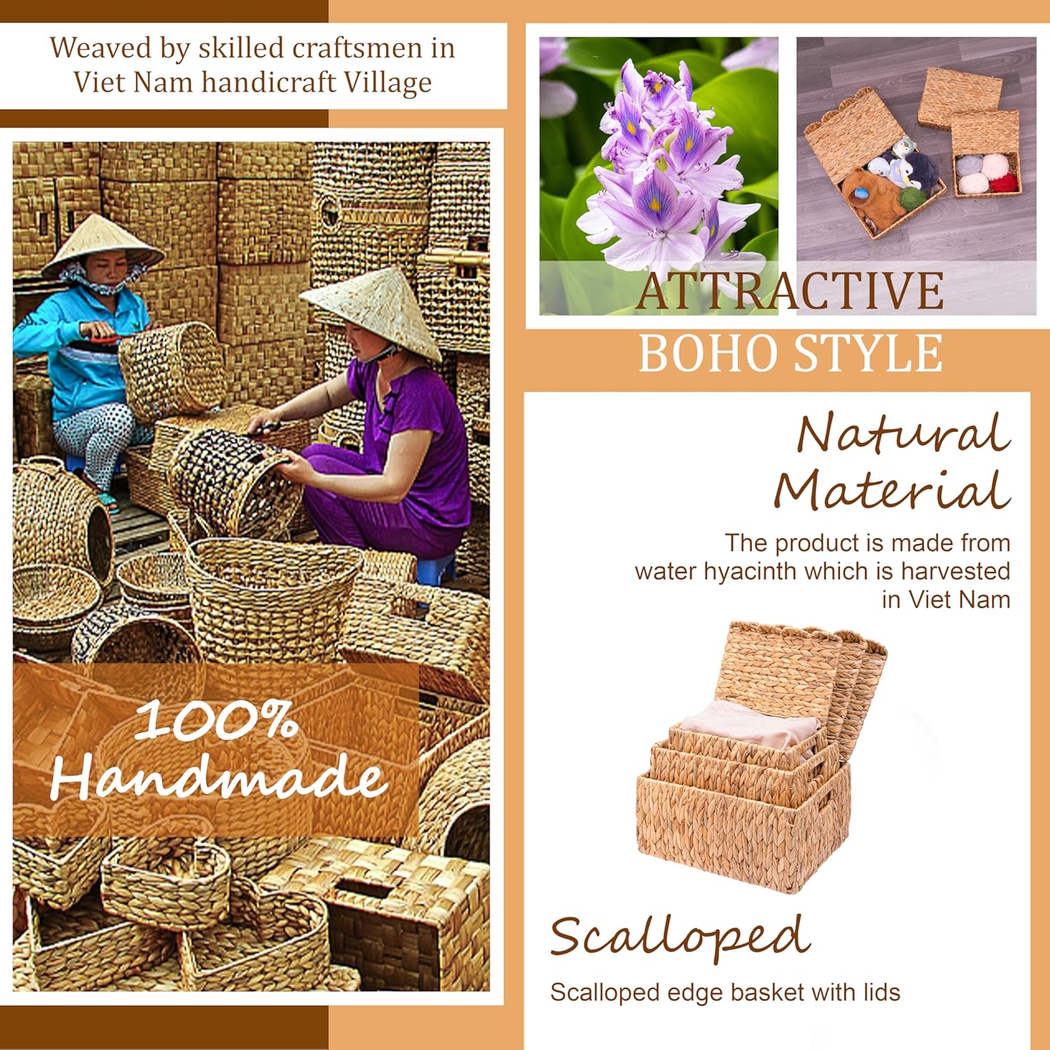 - ๐ฏ ใDurable Materialใ: Wicker basket with lids is made of natural water hyacinth, so they may vary slightly in shape. Designed with a unique weave edge scalloped, these woven baskets are an irresistible piece to coordinate with your furniture. The lids open and close easily and prevent dust from settling on the stored contents.
