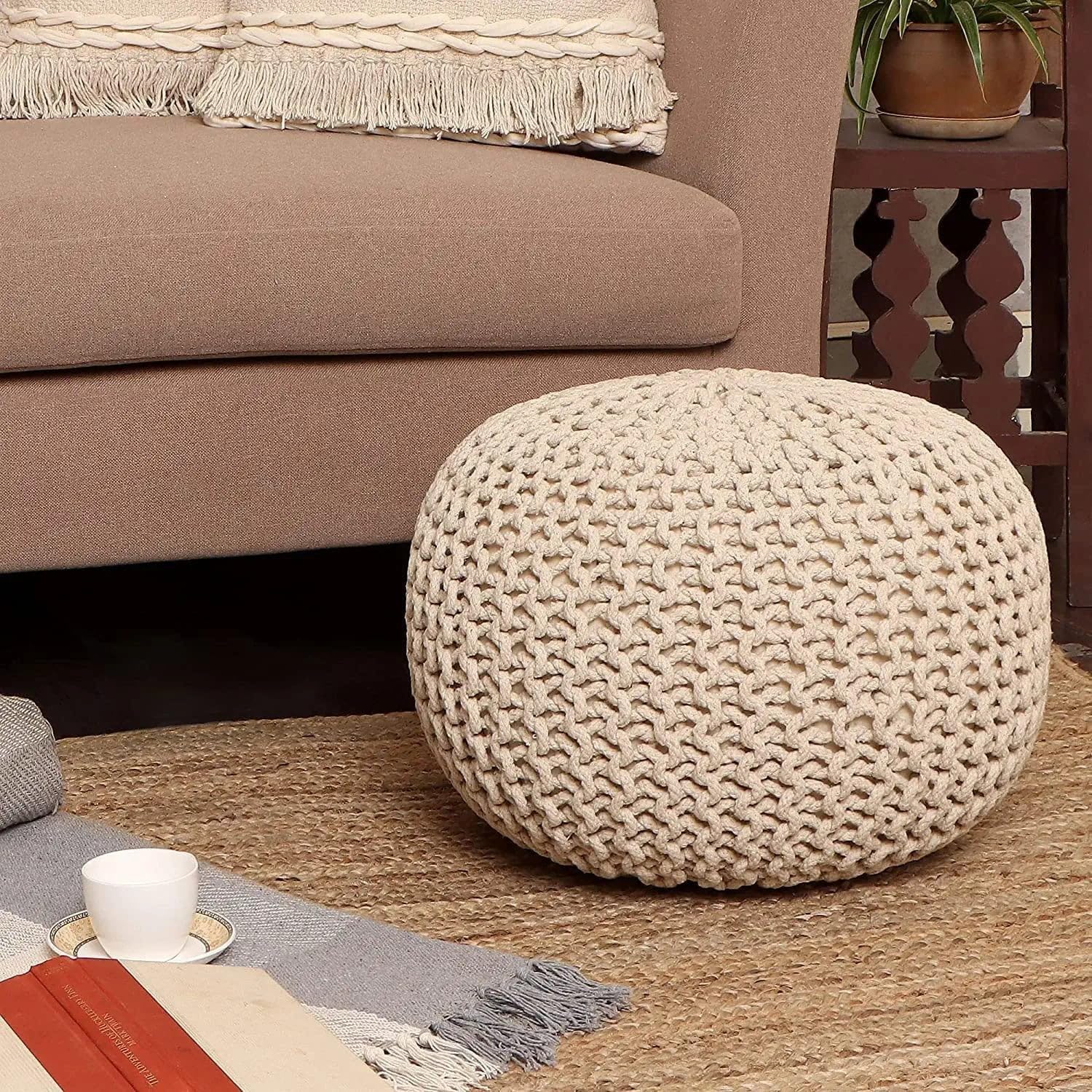 - WHERE STYLE EFFORTLESSLY BLENDS WITH FUNCTION: Our handcrafted circular knitted ottoman foot rest is a beautiful accent piece for the home or your business. This versatile twisted rope pouf compliments any kind of interior décor and is perfect for creating extra seating or for using as a footrest beside a couch or a Footstool. Put one on display in the living room, bedroom, playroom, kids room, nursery, lounge, covered patio, study nook, library or any other corner in and around your home.
