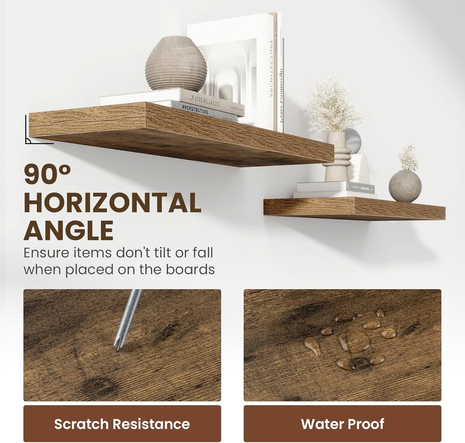 - 【Premium Quality Construction】Crafted from high-grade engineered wood with an invisible one-piece bracket, these floating shelves offer a robust and sleek design. The rustic wooden grain finish not only adds a touch of elegance but also infuses warmth into any room, making them a perfect fit for both modern and traditional interiors.