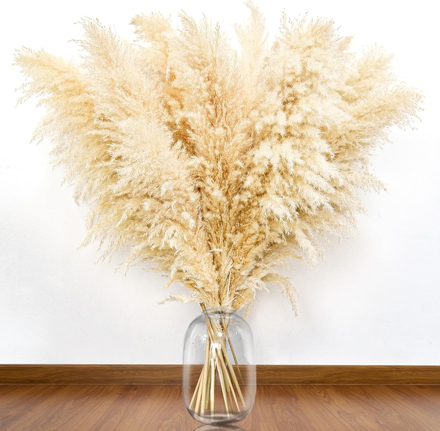 - PAMPAS GRASS DECOR:The color of the tall pampas grass is beige,dried pampas grass is naturally fluffy, beautiful and elegant,you can trim it to the appropriate size and place it in a vase in the sunlight. The beige Pampas grass allows them to breathe in the sunshine and breeze, and this true beige color makes boho dried flowers look more fluffy and elegant.Large pampas grass lovely and beautiful.Tall pampas have a boho style and are suitable for boho flowers, event decors,boho wall decor