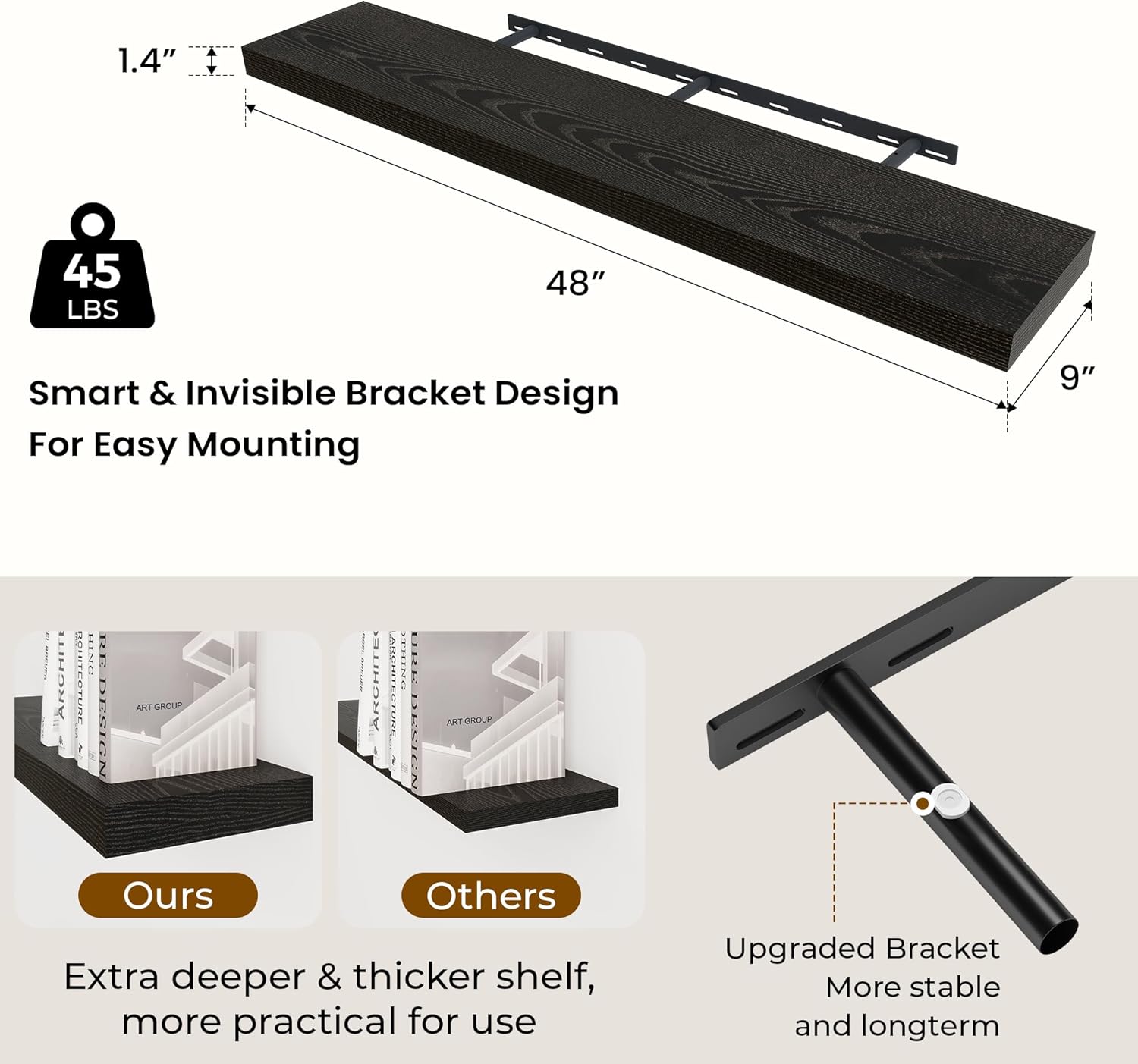 - With extra depth and thickness: This wall-mounted floating shelves measures 48"W x 9.1"D x 1.4"H, featuring an extra-deep and thickened design to maximize storage capacity and support up to 70 lbs. The large floating shelves robust construction allows you to safely display a variety of items, from books to décor. It helps reduce clutter and brings a sleek, modern touch to compact spaces, making it perfect for showcasing your favorite pieces without sacrificing functionality.