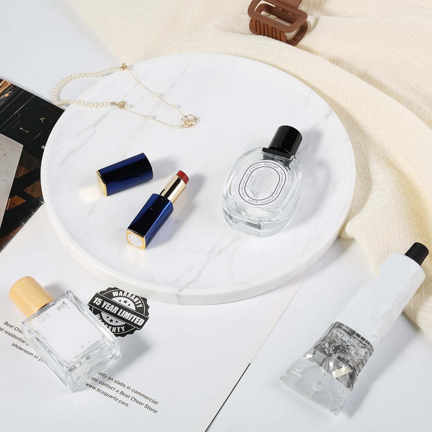 - Suitable Size: Our small round marble tray measures D9.8”x H0.7”. This bathroom counter tray fits bathroom washstands, kitchen counters, coffee tables, bedroom dressers, vanity tops, and bedside tables—ideal for organizing and enhancing your space