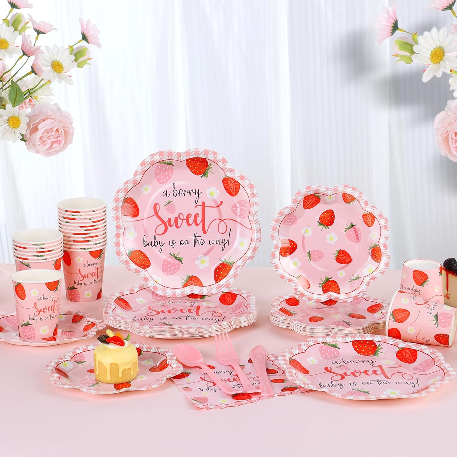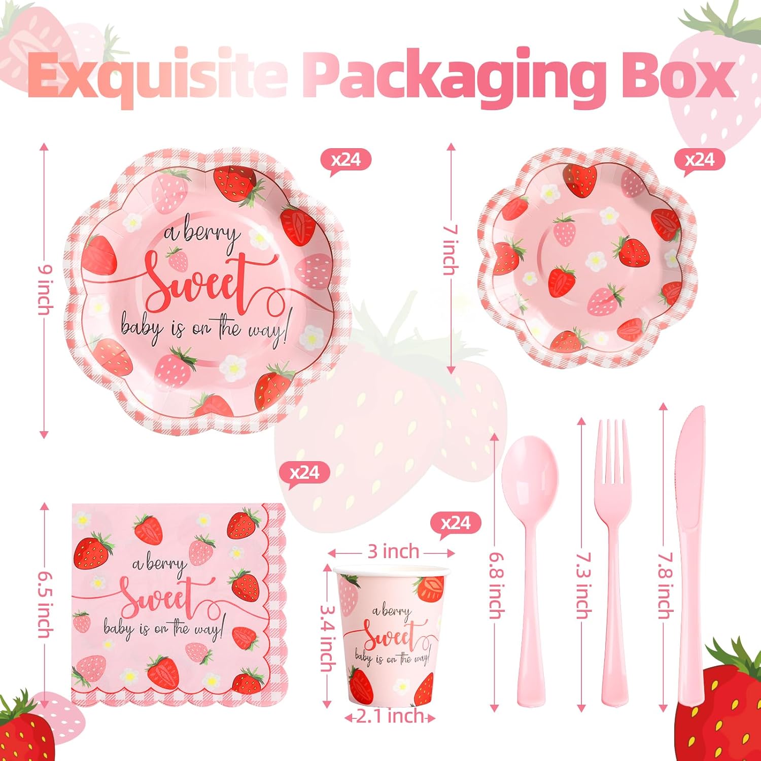 - 【Strawberry Baby Shower Decorations】- Strawberry party decorations include 24 9 inch strawberry baby shower plates, 24 7-inch strawberry paper plates, 24 girl baby shower cups, 24 girl baby shower napkins, 24 sets of pink plastic utensils (forks, spoons, knives), 168pieces in total. This is a great strawberry plates and napkins party supplies.