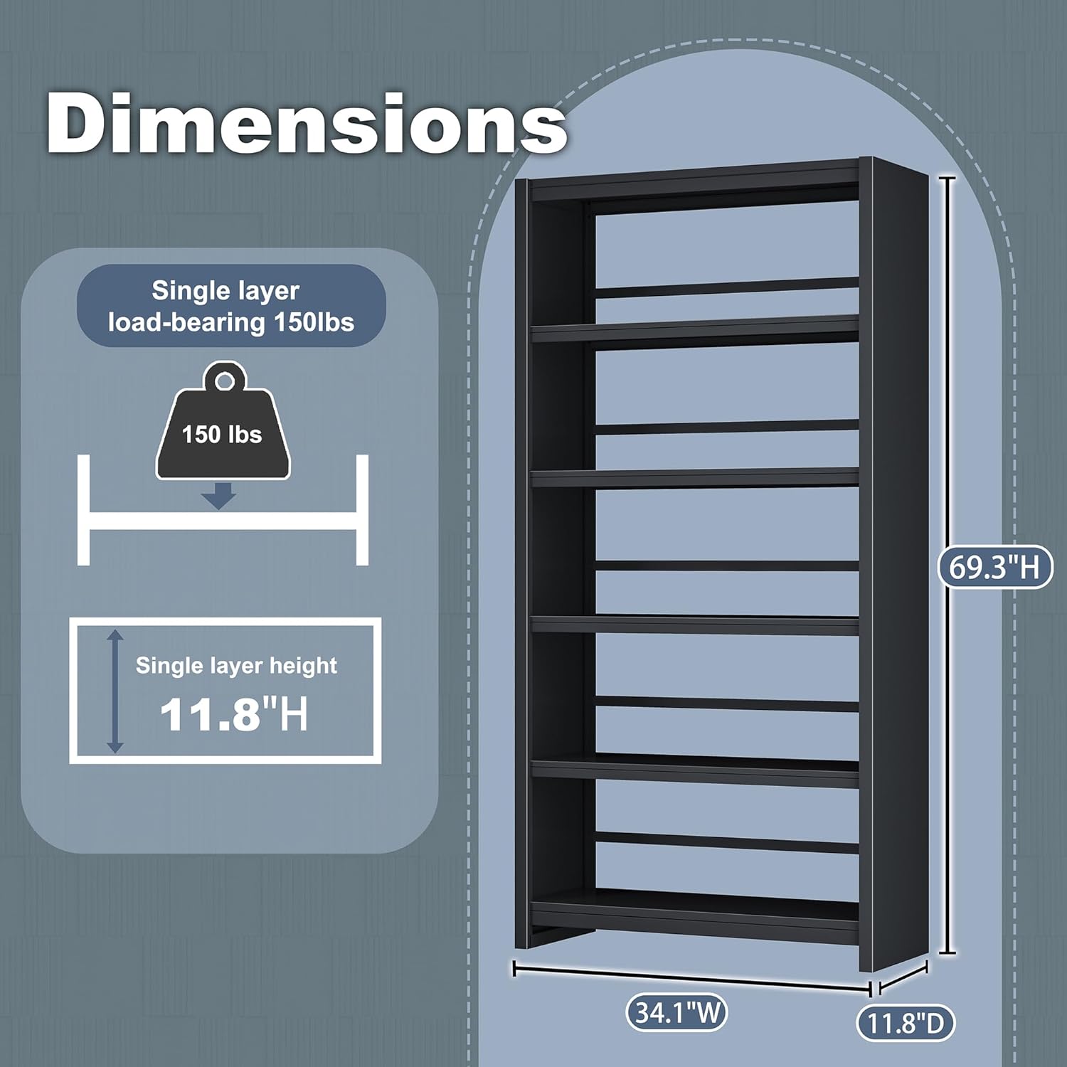 - 【Large Bookshelf】This is 69"H*34"W*11.8"D book shelf. The bookshelf with large storage space can meet your usage needs. The display shelf is suitable for placing books, vinyl records, albums, collectibles, turntables, and figurines.