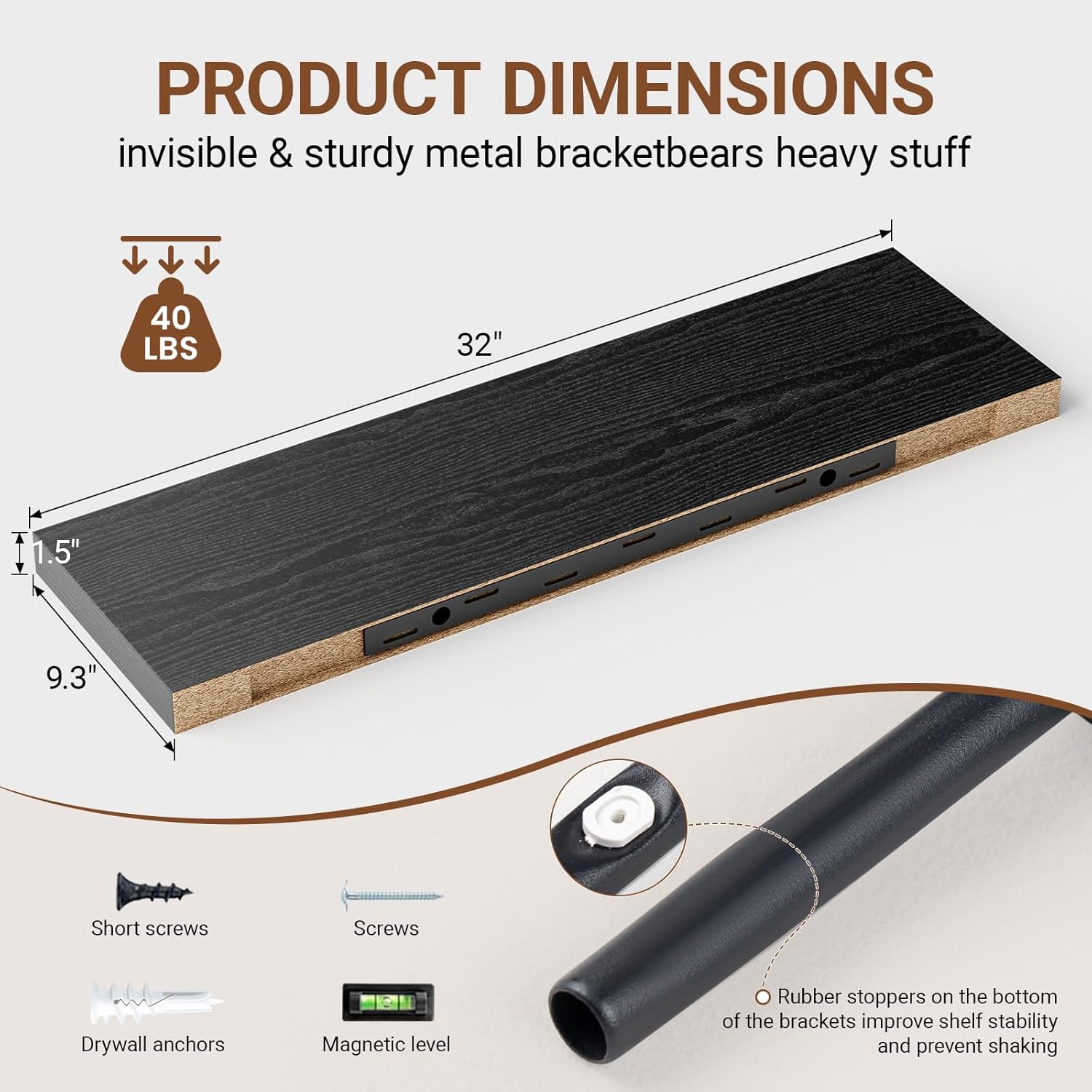 - 【Longer Design】Our pretty 32 inch black wall shelves are 32"W x 9.3"D x 1.5"H.Our 32 floating shelves is longer than traditional designs and can hold more items.The black floating shelf optimize wall space,helping organize essentials without taking up floor space in your home.