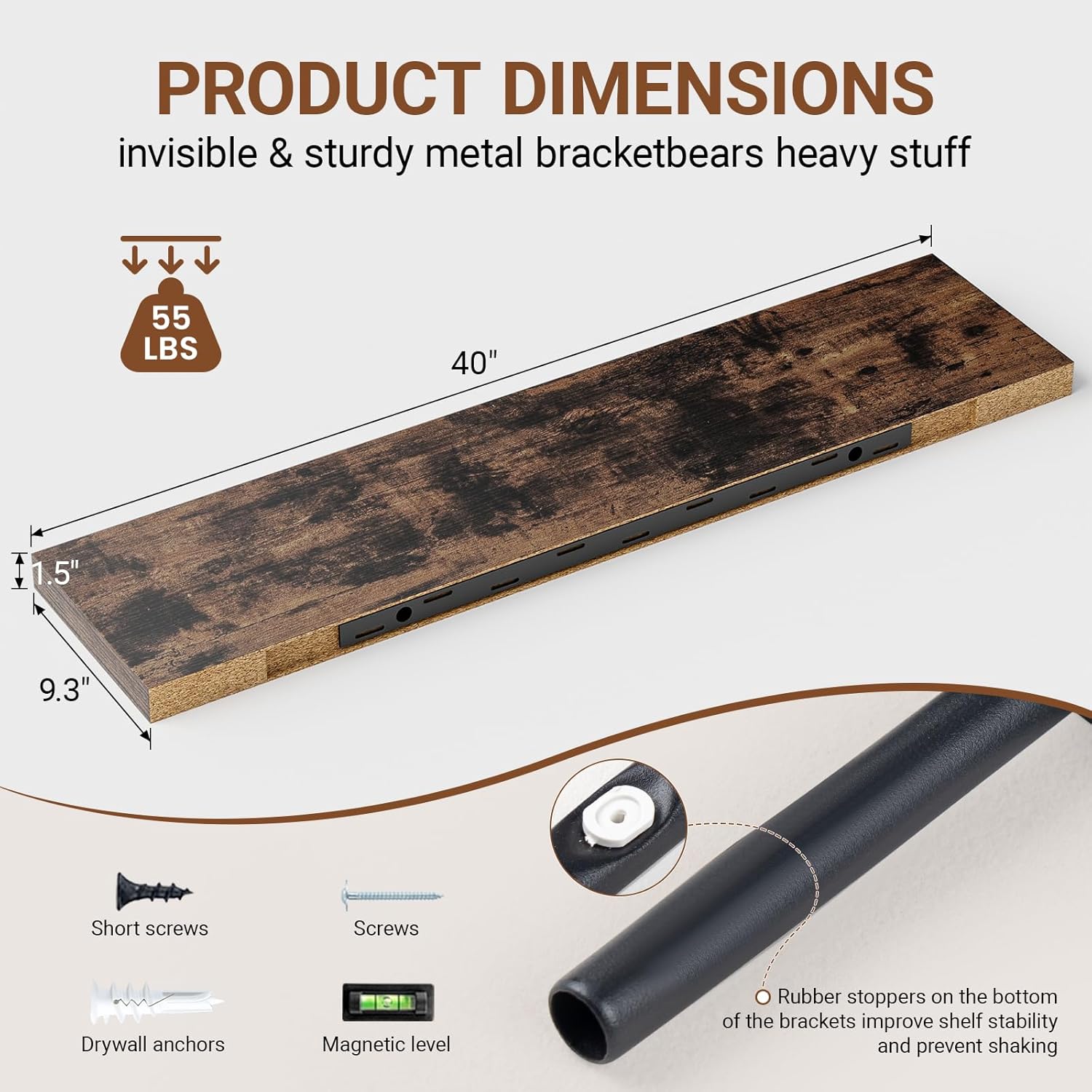- 【Sturdy & Reliable Material】The dark brown floating shelves use metal brackets and screws to be firmly fixed to the wall without sagging.Our 40 inch floating shelf are made of high quality MDF material,can hold up to 55 lbs to safely place your items.