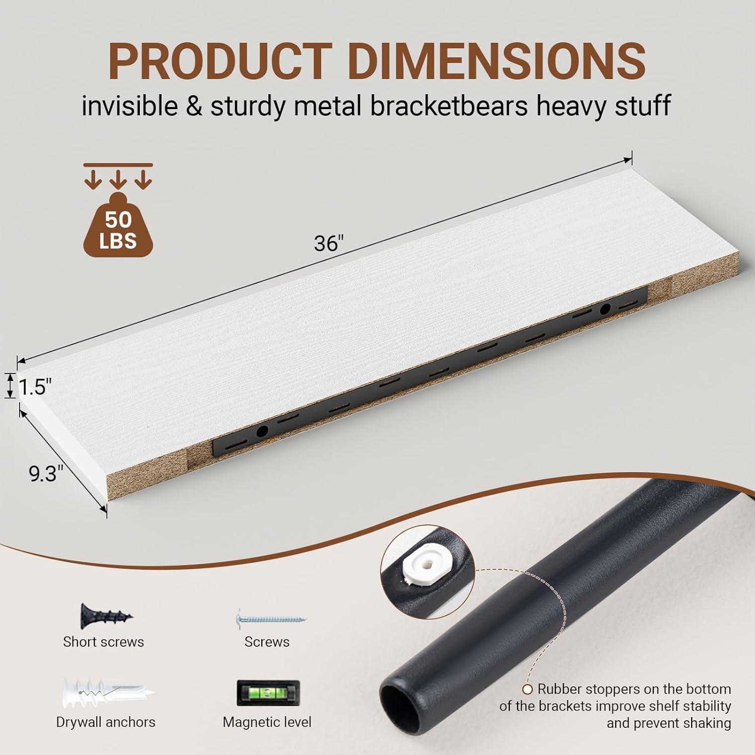 - 【Longer Design】Our pretty 36 inch wall shelves are 36"W x 9.3"D x 1.5"H.Our white floating shelves is longer than traditional designs and can hold more items.The 36 inch white floating shelf optimize wall space,helping organize essentials without taking up floor space in your home.