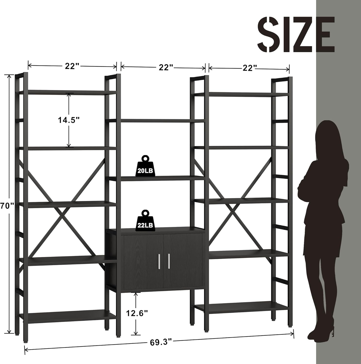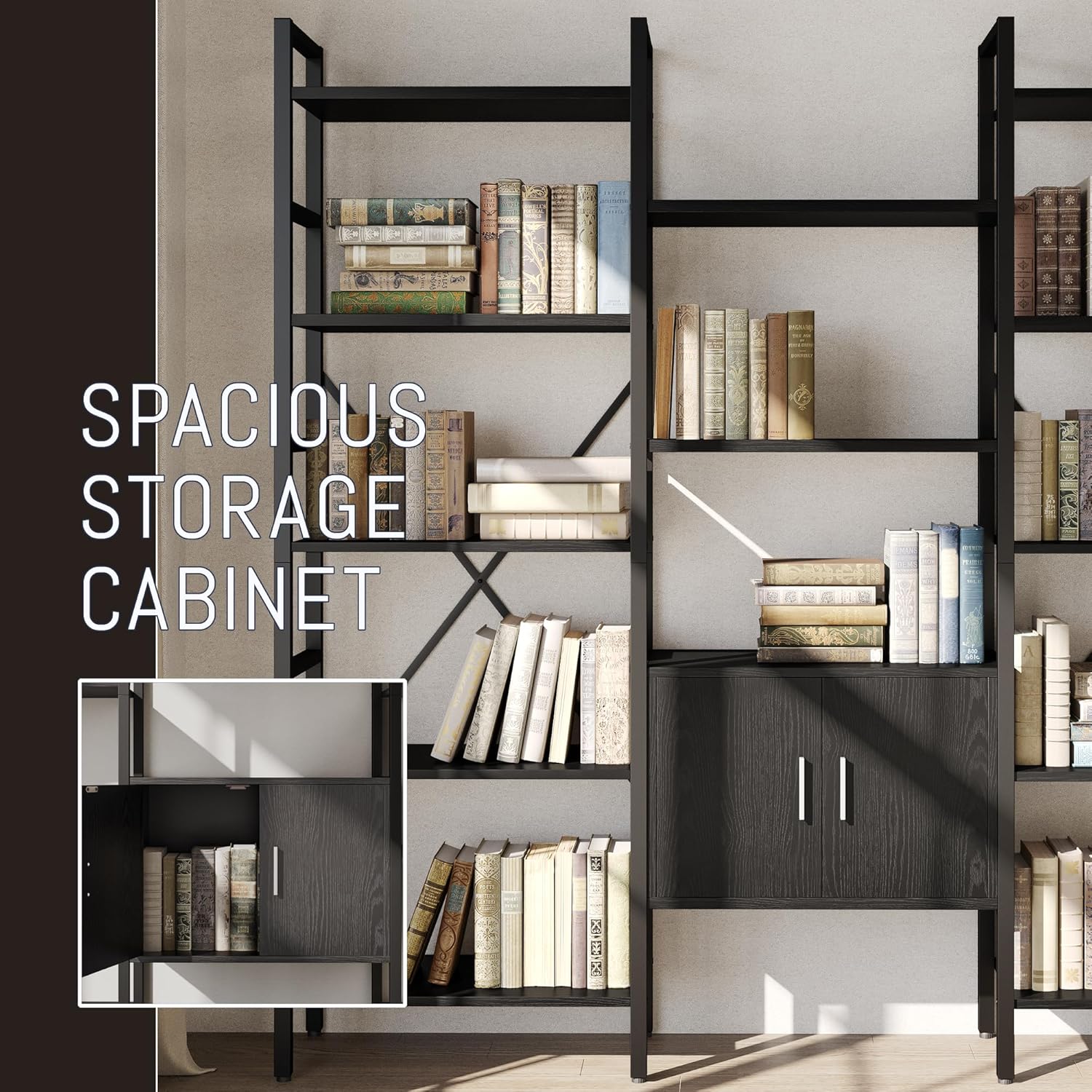 70 x70 Triple 5 Tier Book Shelf, Industrial Large Bookcase with Storage Cabinet, Tall Bookshelf with 14 Open Display Shelves Metal Frame Furniture for Living Room Bedroom Home Office Black