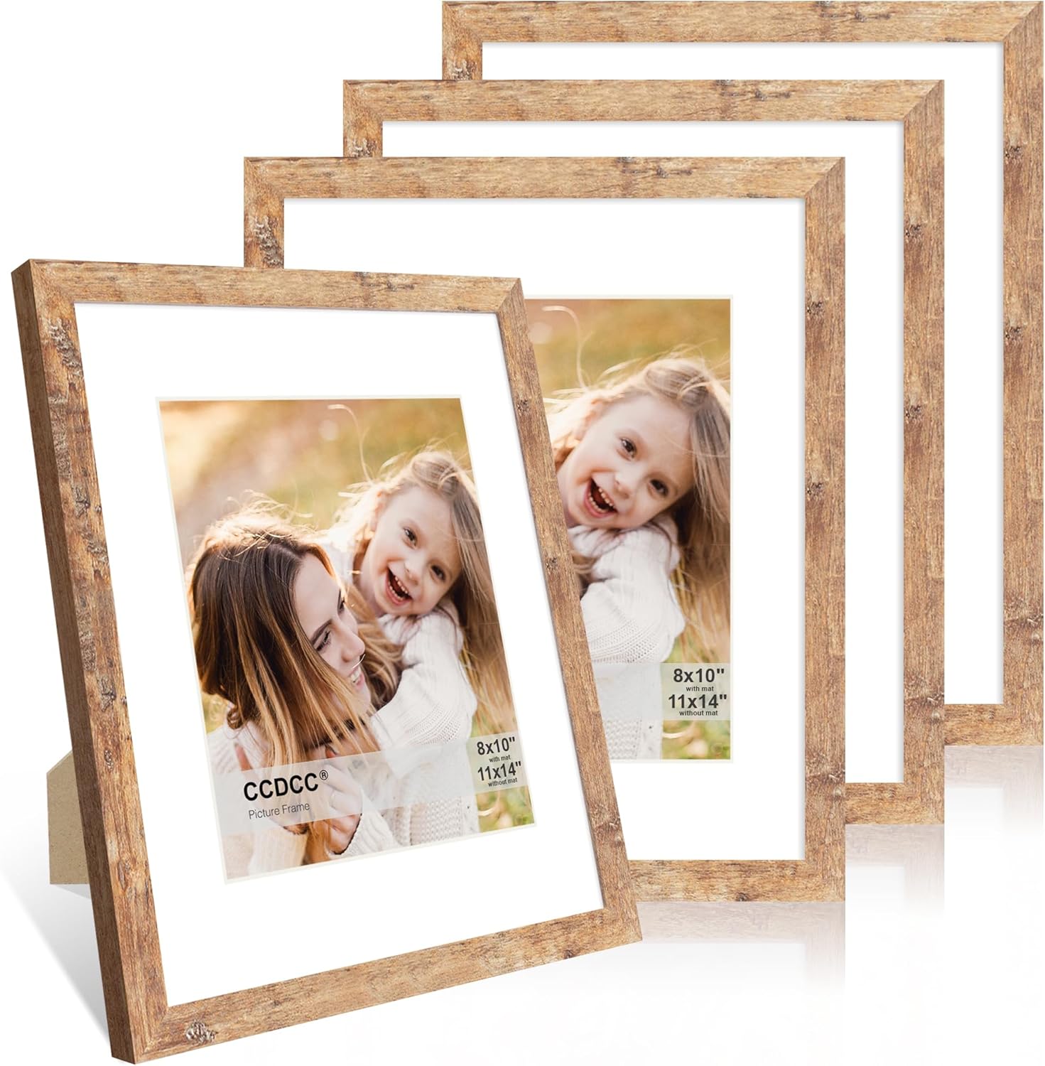 11x14 Picture Frame Set of 4, 11 x 14 Wood Photo Frames with Mat for 8x10, Natural Wooden Frame with Real Glass Cover for Wall and Tabletop Display,Brown