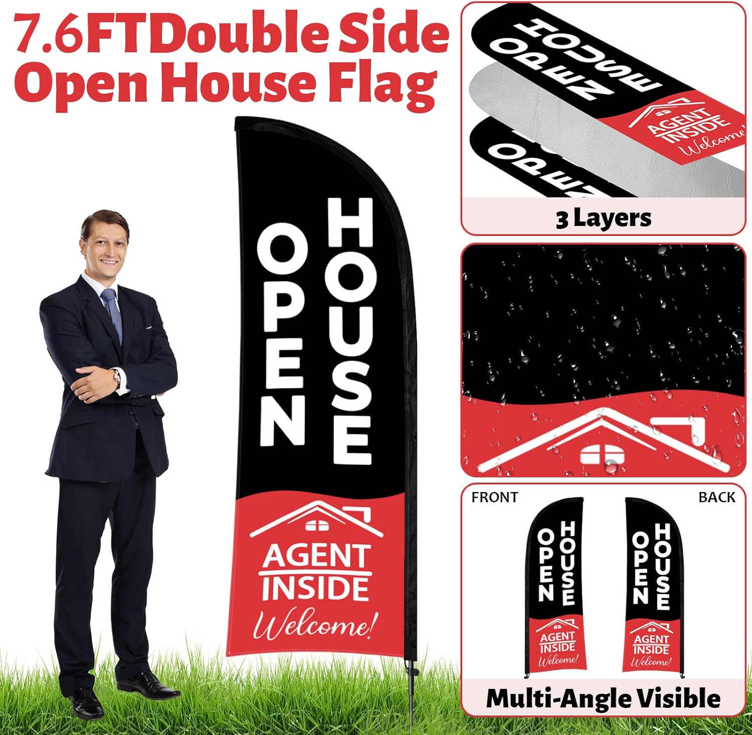 - 44 Pcs Open House Supplies:Package Included: 7.6 x 5.4 Ft:Double-sided Flag with Poles (1x Drawstring bag), 5 Pack x Real Estate Sale Signs with Stakes Double Sided:16 x 12 inches ; 30 PCS x Open House Balloons, 1 Roll x Curling Ribbon, 2 PCS x Balloon Glue Point, 1 PCS x Marker Pen, 4 PCS x Water Bottle Hang Tags, Open house signs for real estate agent and house for sale signs by owner.
