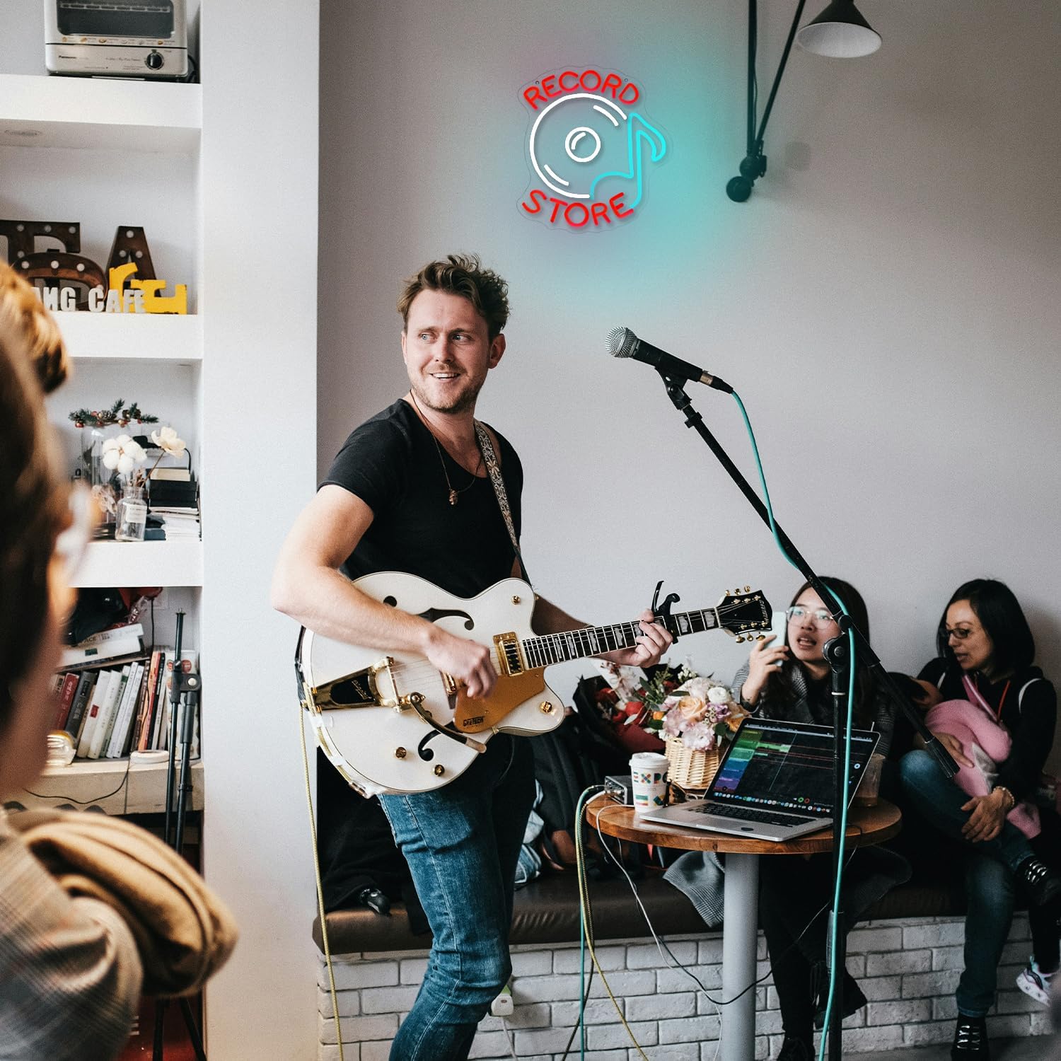 Record Store Neon Sign Music Neon Signs for Wall Decor Letter Neon Light Record Player Sign Live Music Neon Light Sign for Bar Concern Studio Decor(Red white)