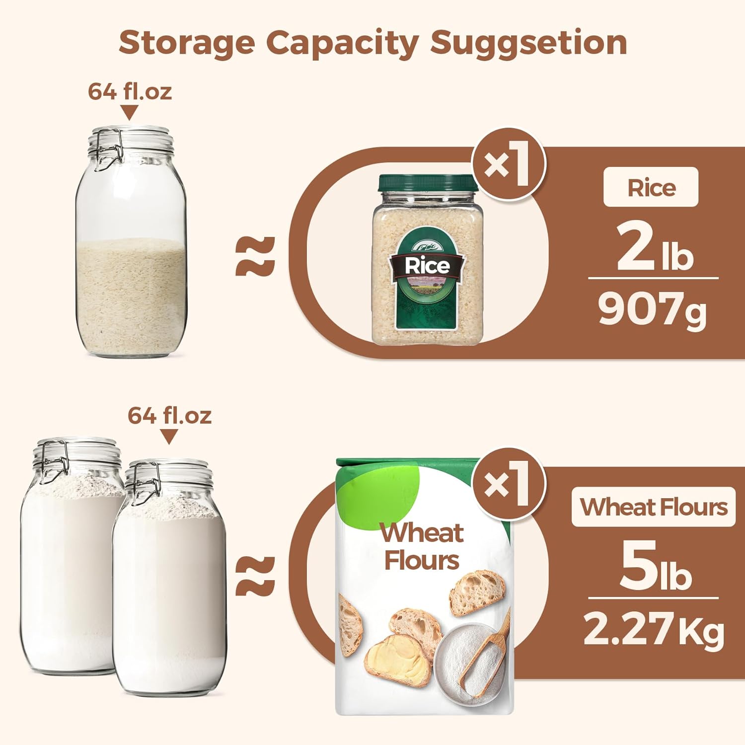 - Leak-Proof Large Jars: These 64 oz mason jars boast a secure locking clamp and airtight silicone seal, ensuring leak-proof storage and keeping your food fresh and pest-free. Ideal for storing liquids like vanilla, juice,soups or sauces with no spills