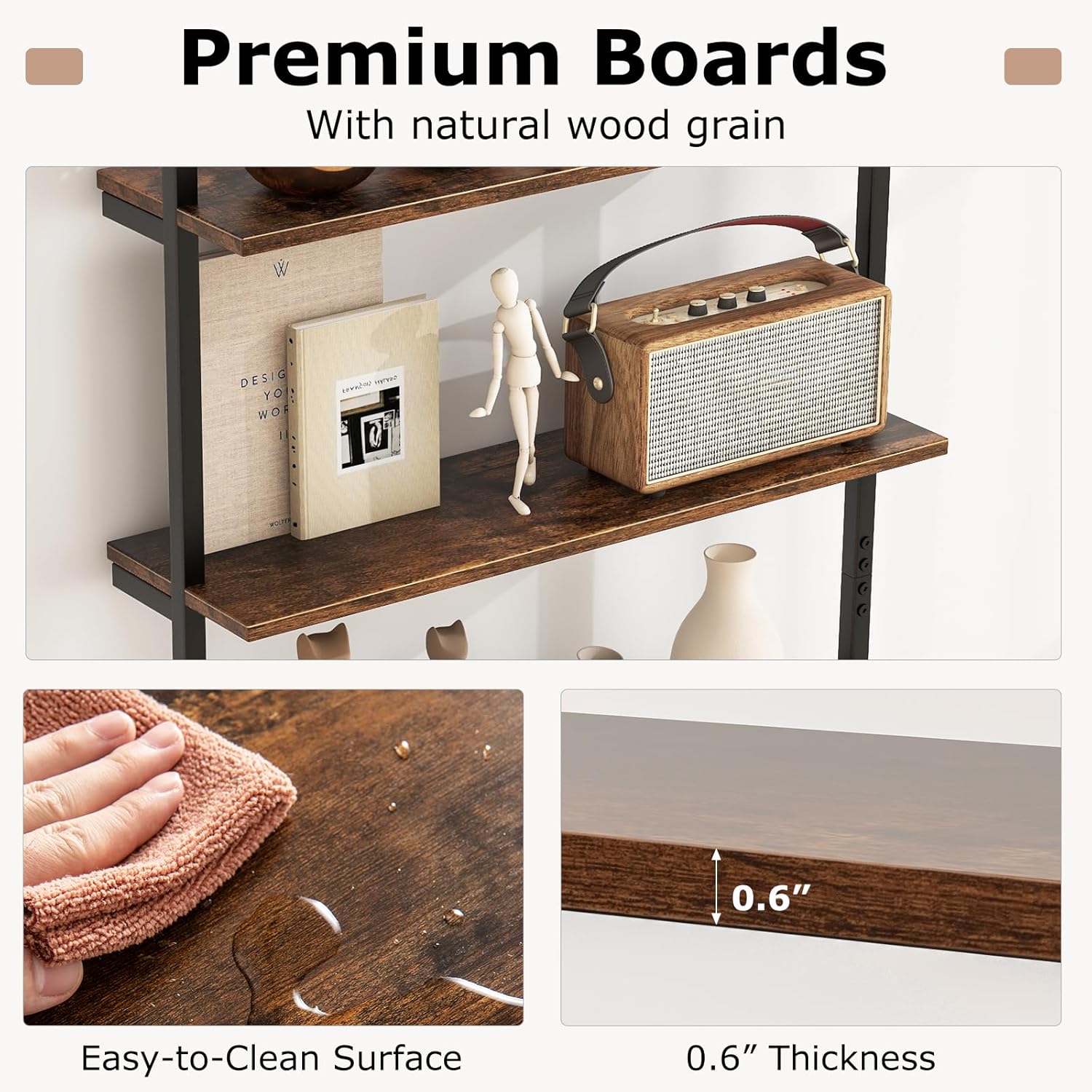 Giantex 4-Tier Industrial Bookshelf, Wall Mounted Pipe Shelving Unit, Floating Shelves with Metal Frame, Hanging Wall Display Shelf, Wood Ladder Bookshelf for Living Room, Kitchen, Rustic Brown