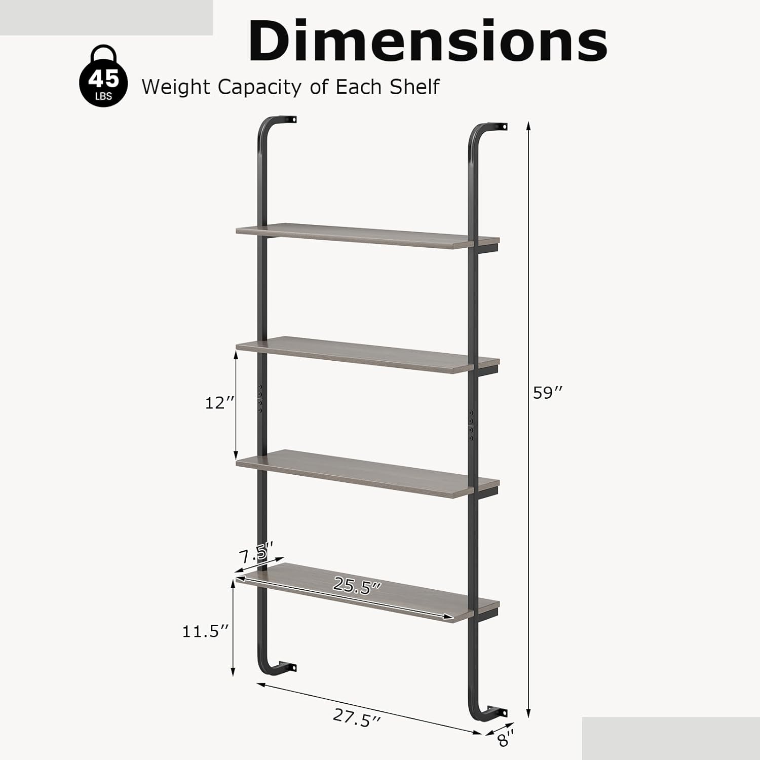 - [Space-Efficient Floating Design]: Easily mountable on the wall, this floating bookshelf maximizes storage without taking up floor space. Measuring 27.5" x 8" x 59" (L x W x H), it efficiently utilizes vertical space, offering a compact solution for smaller rooms.