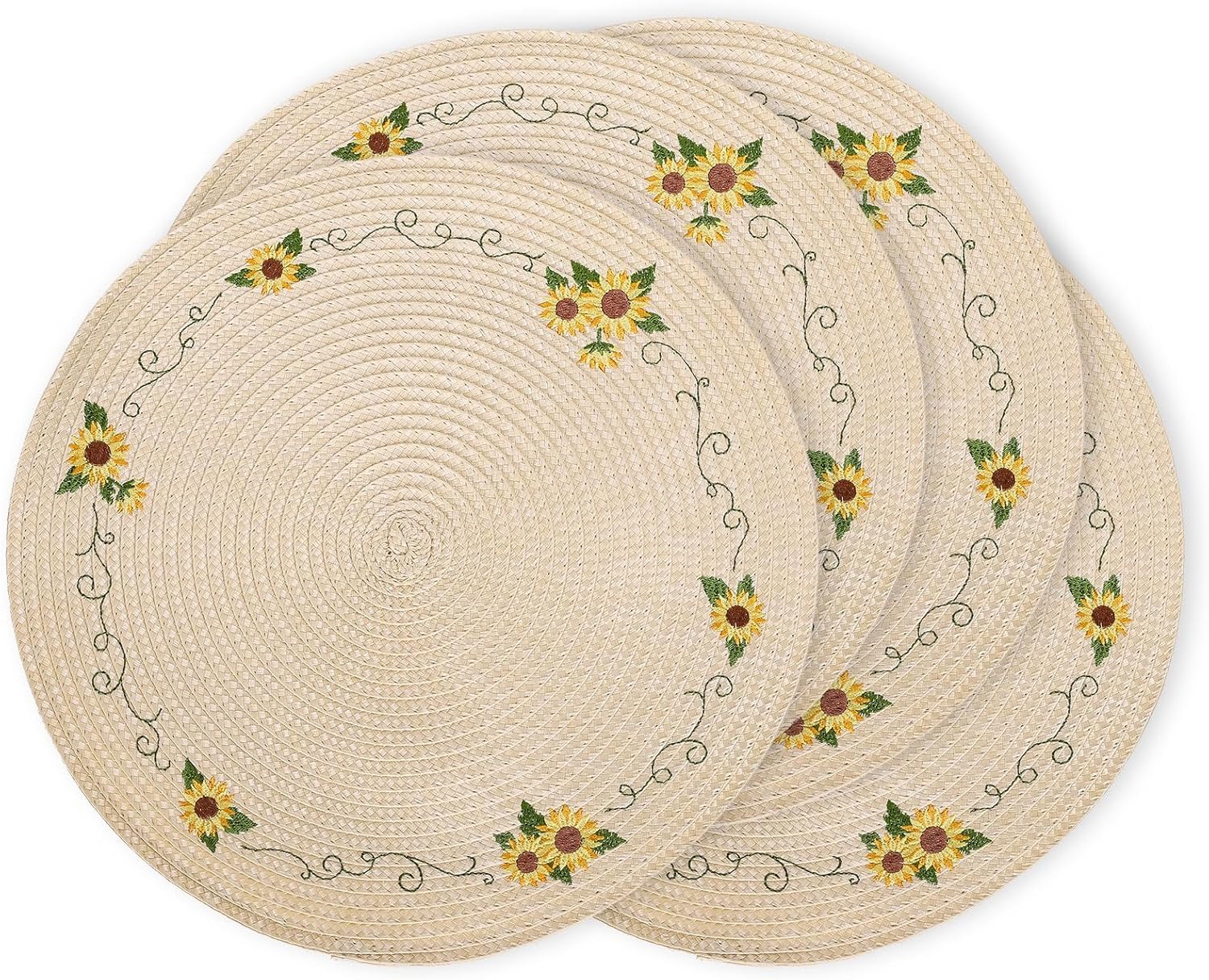 Whaline 4Pcs Round Sunflower Placemats Spring Summer Flower Embroidered Place Mats Floral Dinner Table Mats for Home Holiday Birthday Baby Shower Party Decor