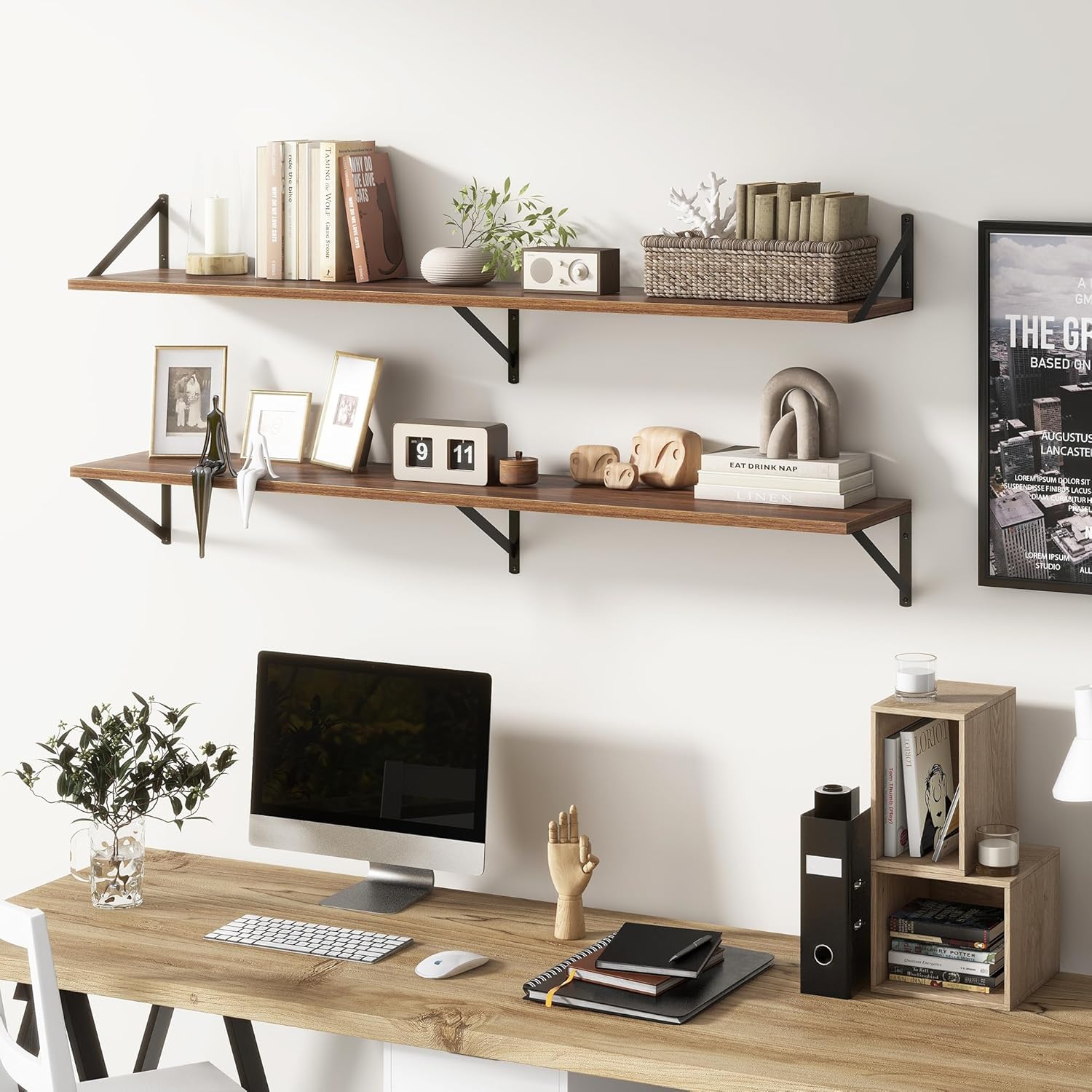 - 【DECORATIVE & FUNCTIONAL】The wall-mounted floating shelves are designed for decoration and storage, utilizing and decorating any space in your home. Used as shelf decor to show your collection, books, or prize, the hanging shelves are perfect for displaying your photo frame, small plants, model, or audio in your living room, office, study. And can also use as over the toilet storage shelf in the bathroom to hold toiletries or used as kitchen shelf to storage condiments.