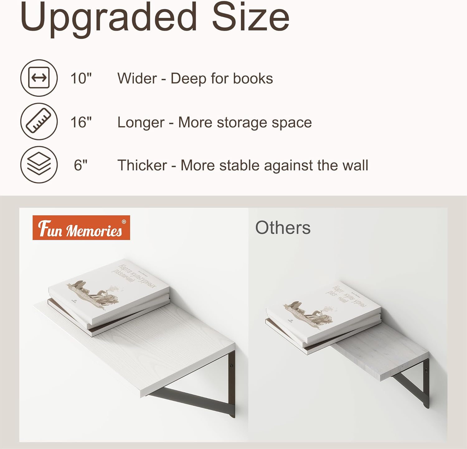 Fun Memories 10 Inch Deep Floating Shelves, White Floating Shelf 16 Inch Long, 16" W x 10" D Wall Shelves Set of 2, Deep Shelves for Books, Wide Floating Shelves for Bahtoom, Living Room, Kitchen