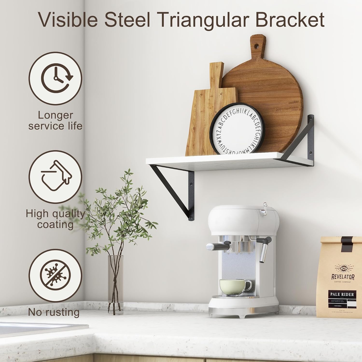 - 【FARMHOUSE RUSTIC WALL SHELF】These floating shelves are made of premium engineered wood board and visible triangular bracket. The rustic wooden grain surface add character and warmth to any modern or traditional interior with these deep floating shelves, contrast shelves at staggering heights on the wall or mount side-by-side or in the corner for a clean streamlined look.