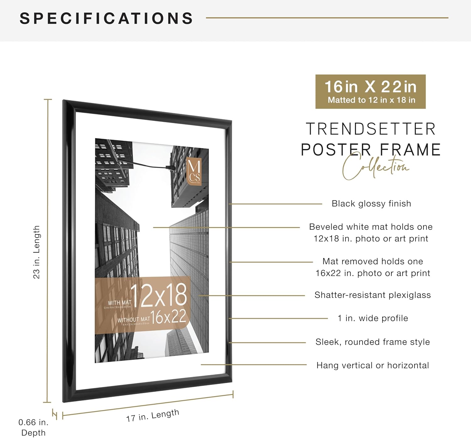 - DIMENSIONS: Each large wall picture frame features a sleek black profile & holds a 16 x 22-inch poster without the mat, or use the included mat for 12 x 18-inch display.