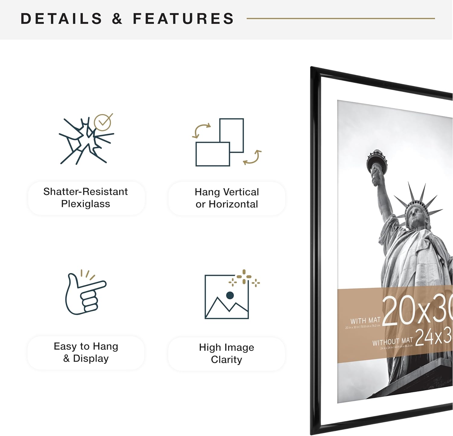 - DIMENSIONS: Each large wall picture frame features a sleek black profile & holds a 24 x 34-inch poster without the mat, or use the included mat for 20 x 30-inch display.