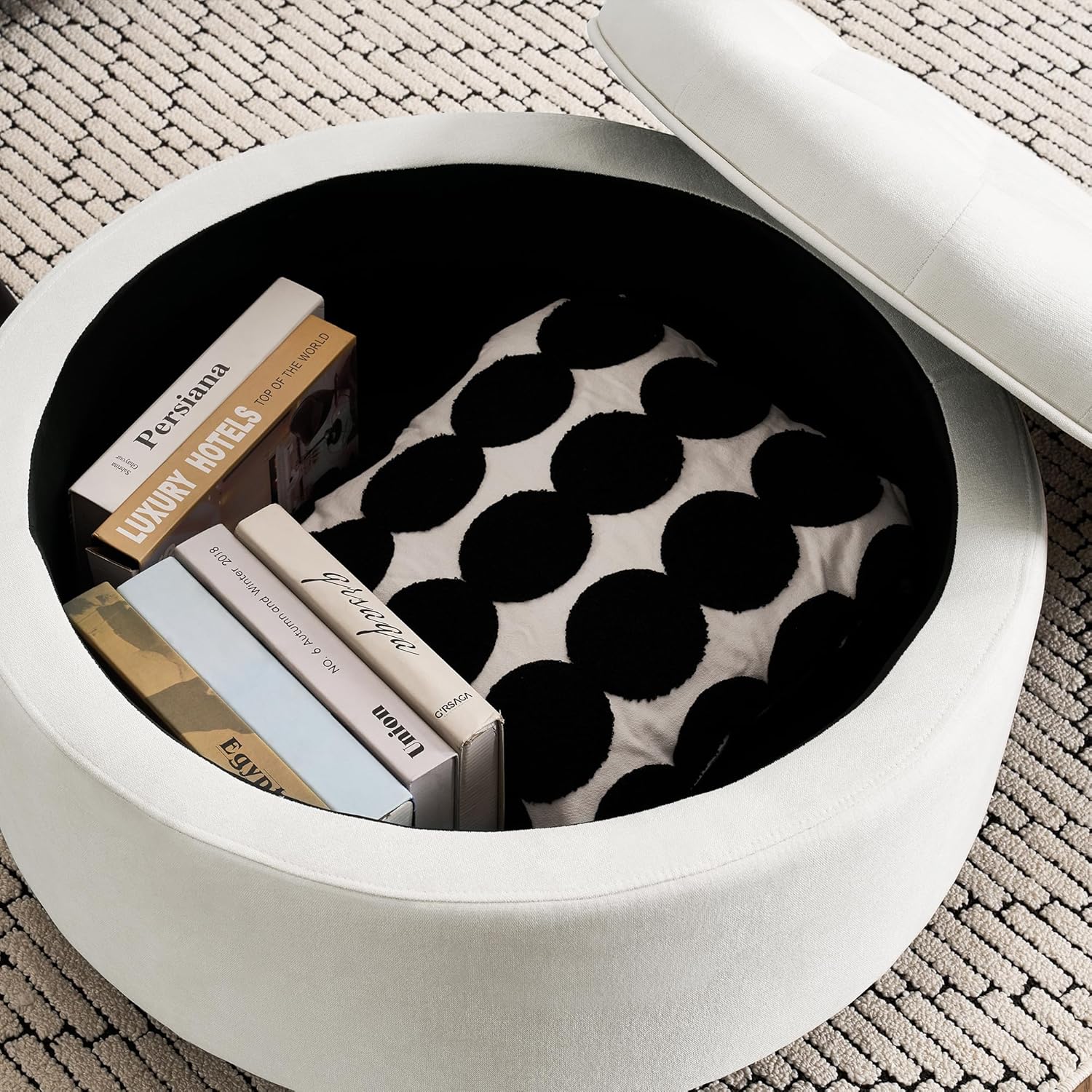 - Space-saving Storage: Large round ottoman keep your living space clutter-free while offer ample hidden storage space, perfect for blankets, books, toys, and other sundries. The removable top lid allows for easy access