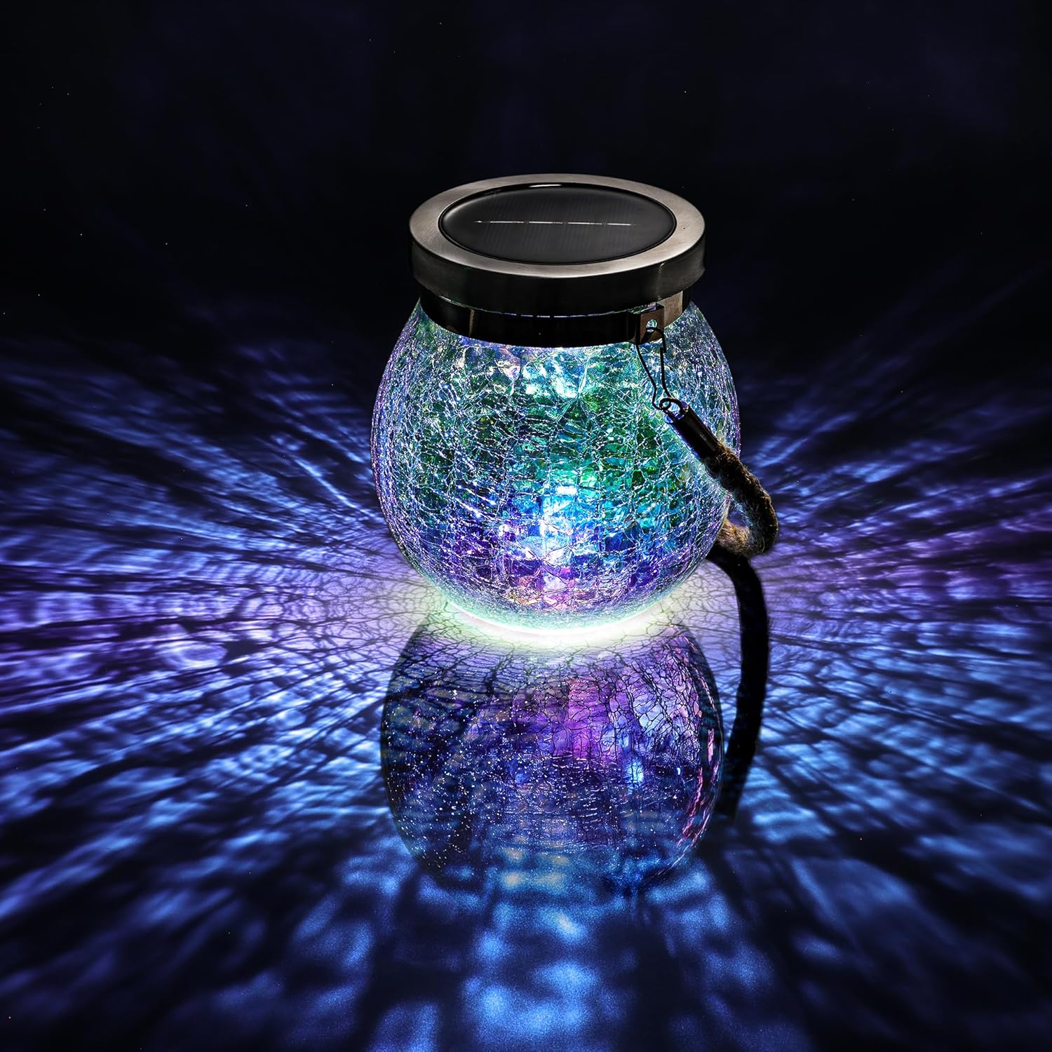 - 《 Built Solid, Hangs Strong—Now in Iridescent Glass》This isn’t just thick crackle glass—it’s electroplated with a color-shifting rainbow finish that dazzles from every angle in daylight. The round body sits securely on flat surfaces, while the stainless steel collar and durable jute rope let it hang with confidence. Heavy in hand, radiant in light, and designed to captivate—day or night.,
