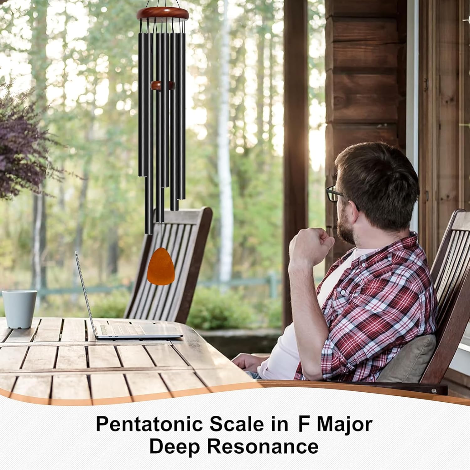 - 50 inch Large Deep Tone Wind Chimes for Outside: This wind chime has a total length of 42 inches and uses a 6-length combination of 18.75/17.7/16.7/15.3/14.4/13.25. The scale is manually adjusted to F major, creating a relaxing and deep tone melody. The tube with diameter of 1 inch and wall thickness of 0.06 inches creates a deep, rich, and aesthetically pleasing sound. When a gentle breeze blows, wind chimes play music like church bells, making you feel relaxed and calm.