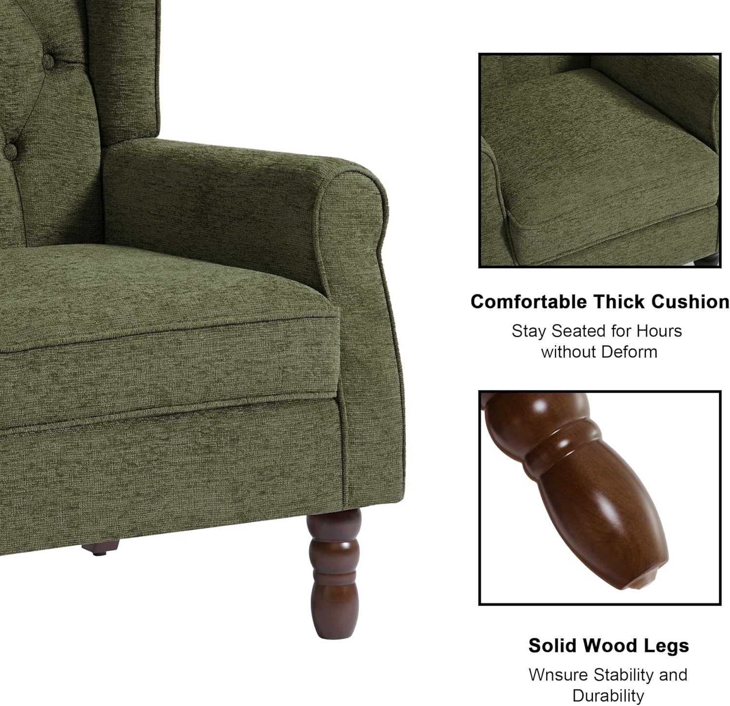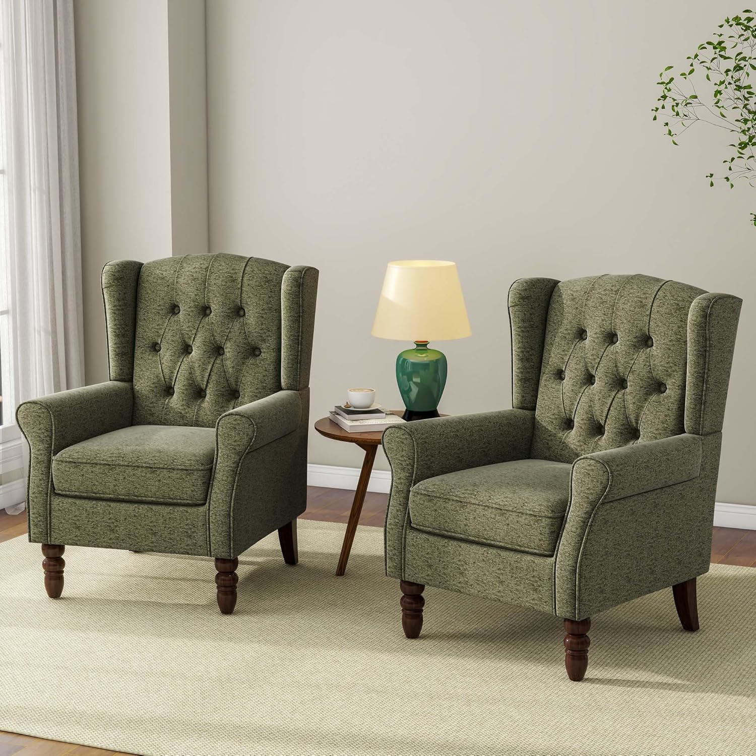 Accent Chair, Upholstered Armchair with Button Tufted High Back & Solid Wood Legs, Comfy Wingback Reading Single Sofa Chair for Small Spaces, Living Room, Bedroom (Green, Set of 2)