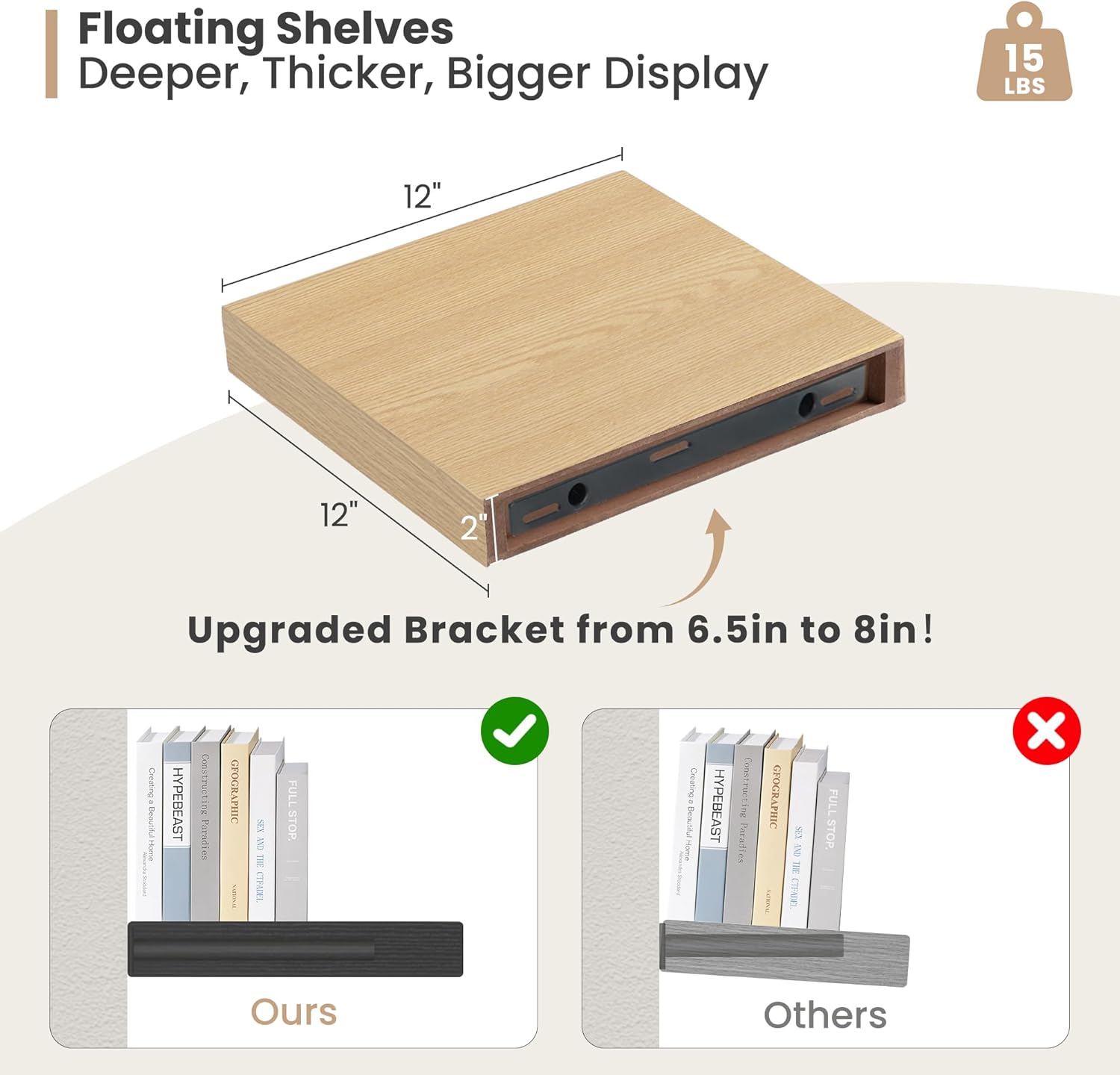 Heimlove 12 Inch Deep Floating Shelves, 12 x 12 inches Long Wall Shelf, Large Extra Display Shelf & Storage Shelf, Rustic Wood Wall Shelves for Fireplace Mantel, Oak - 2Pack