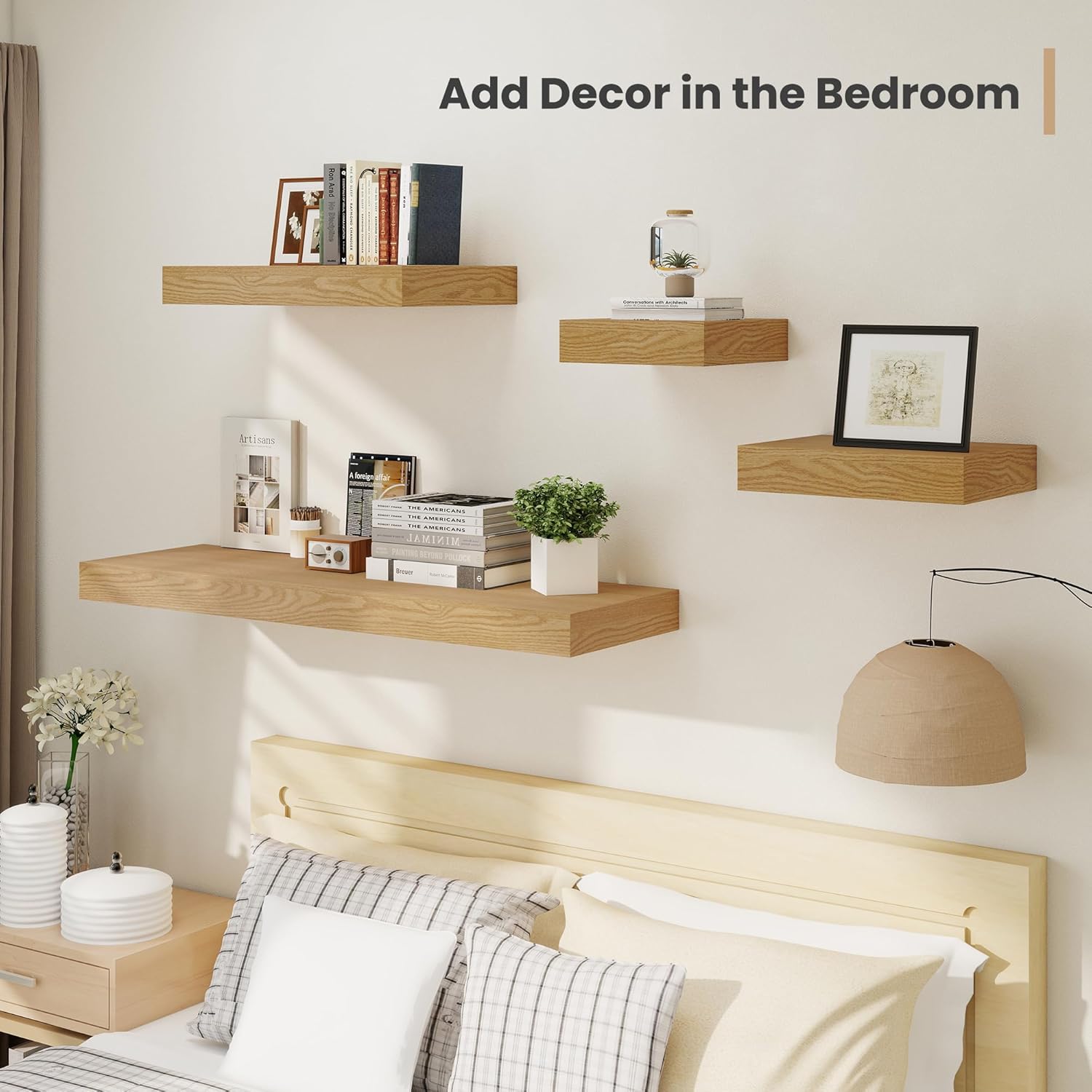 - Random DIY- Place them randomly according to your preference, such as right-left, upper-lower, and ladder-like forms. More and better patterns can be designed by using more wall-mounted shelves. With them, you could create your unique styling.