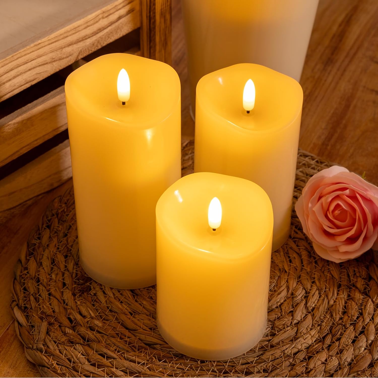 - Realistic Appearance: Unlike ordinary candles, ours feature a 3D wick ( not moving flame ) that creates a lifelike flicker, bringing the warmth of a real flame without the risk. The LED pillar candles have irregular edges, mimicking how real candles burn unevenly, adding to their authentic beauty. When lit, these candles offer stunning visuals from different angles. Additional, with no dripping wax or open flame, ensuring safe for children and pets