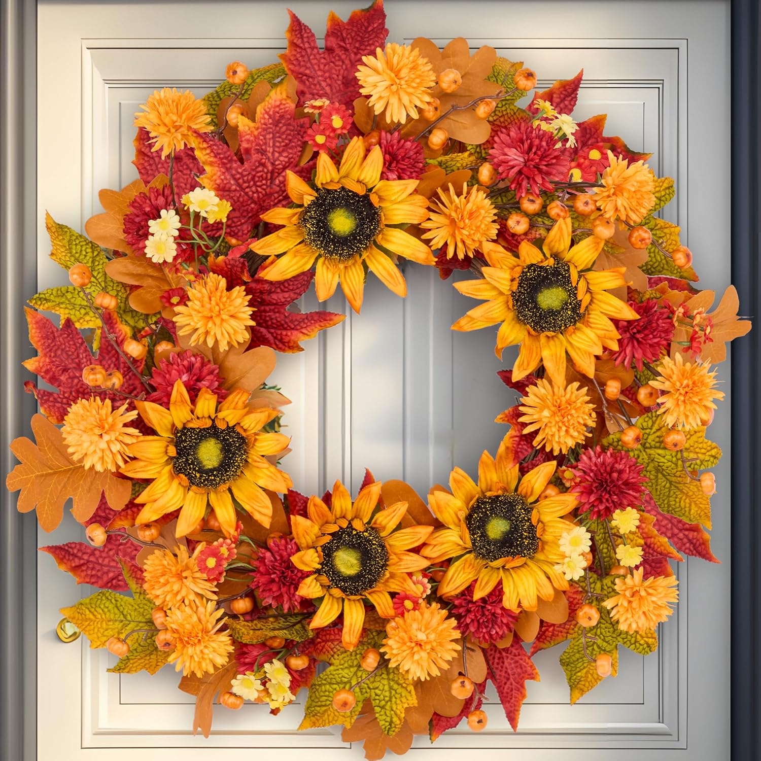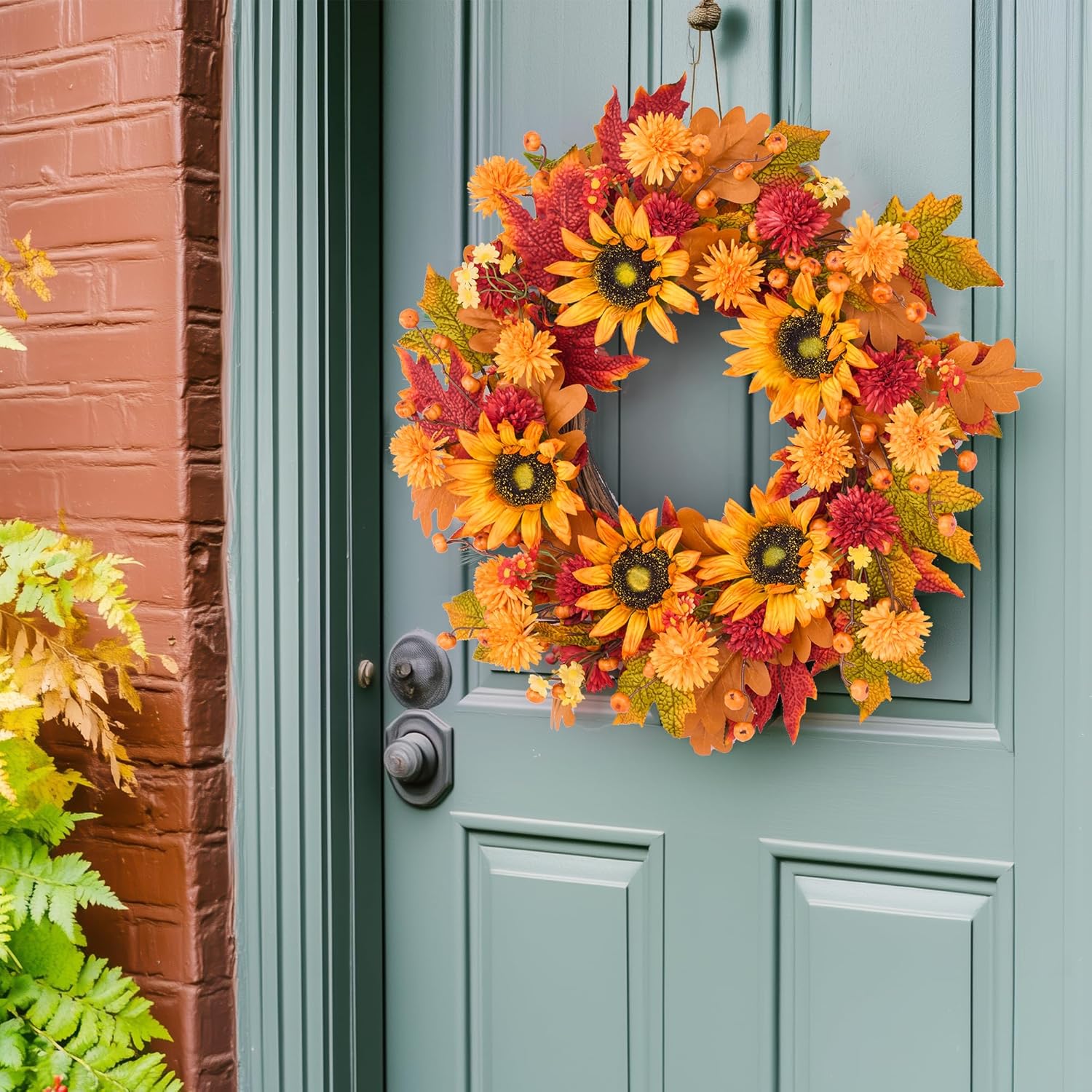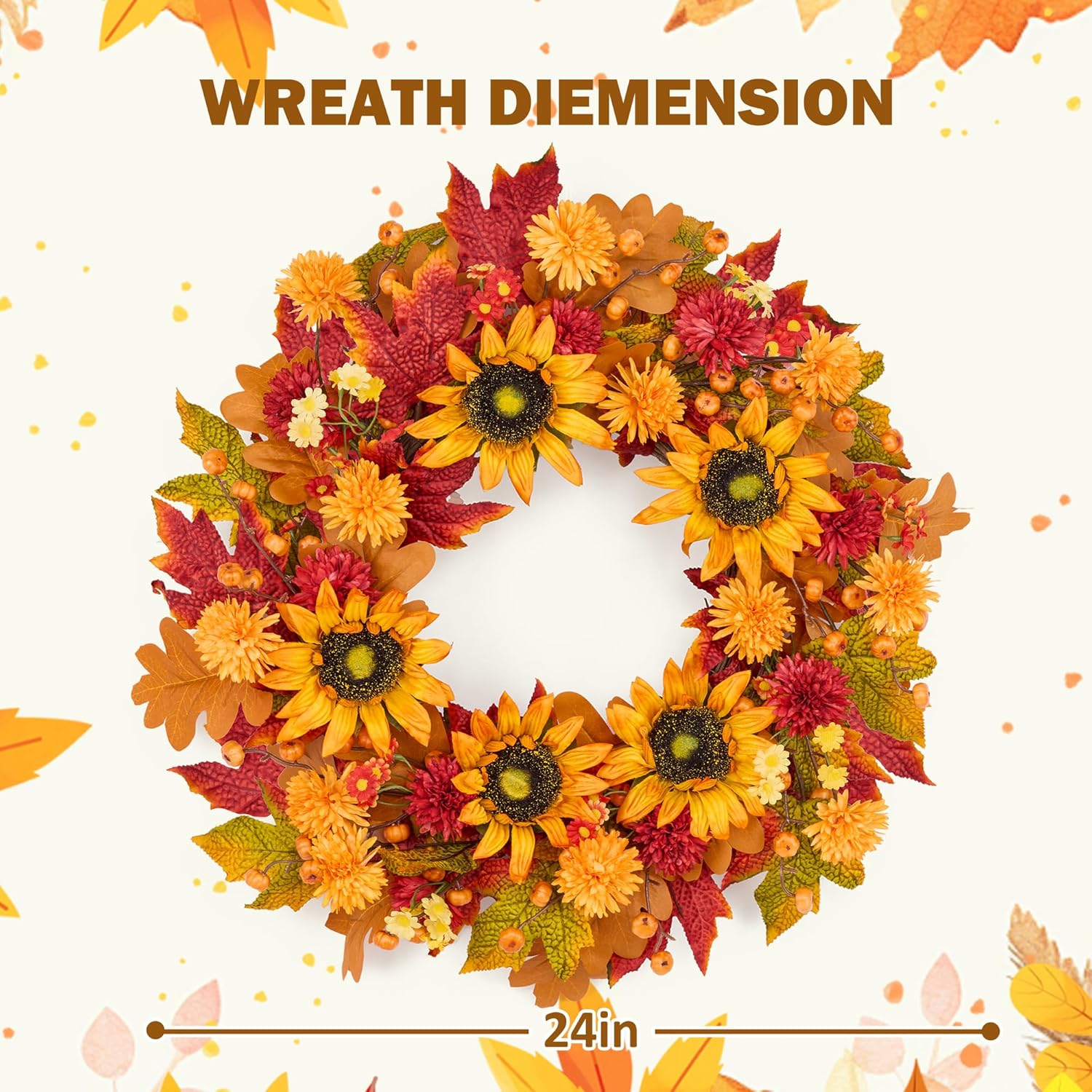 GENMOUS 24 Inch Fall Wreaths for Front Door, with Mini Pumpkin Skewers- Sunflower Wreath, Autumn Fall Decor Maple Leaf Daisy Thanksgiving Halloween Home Party Fall Decoration Indoor Oudoor