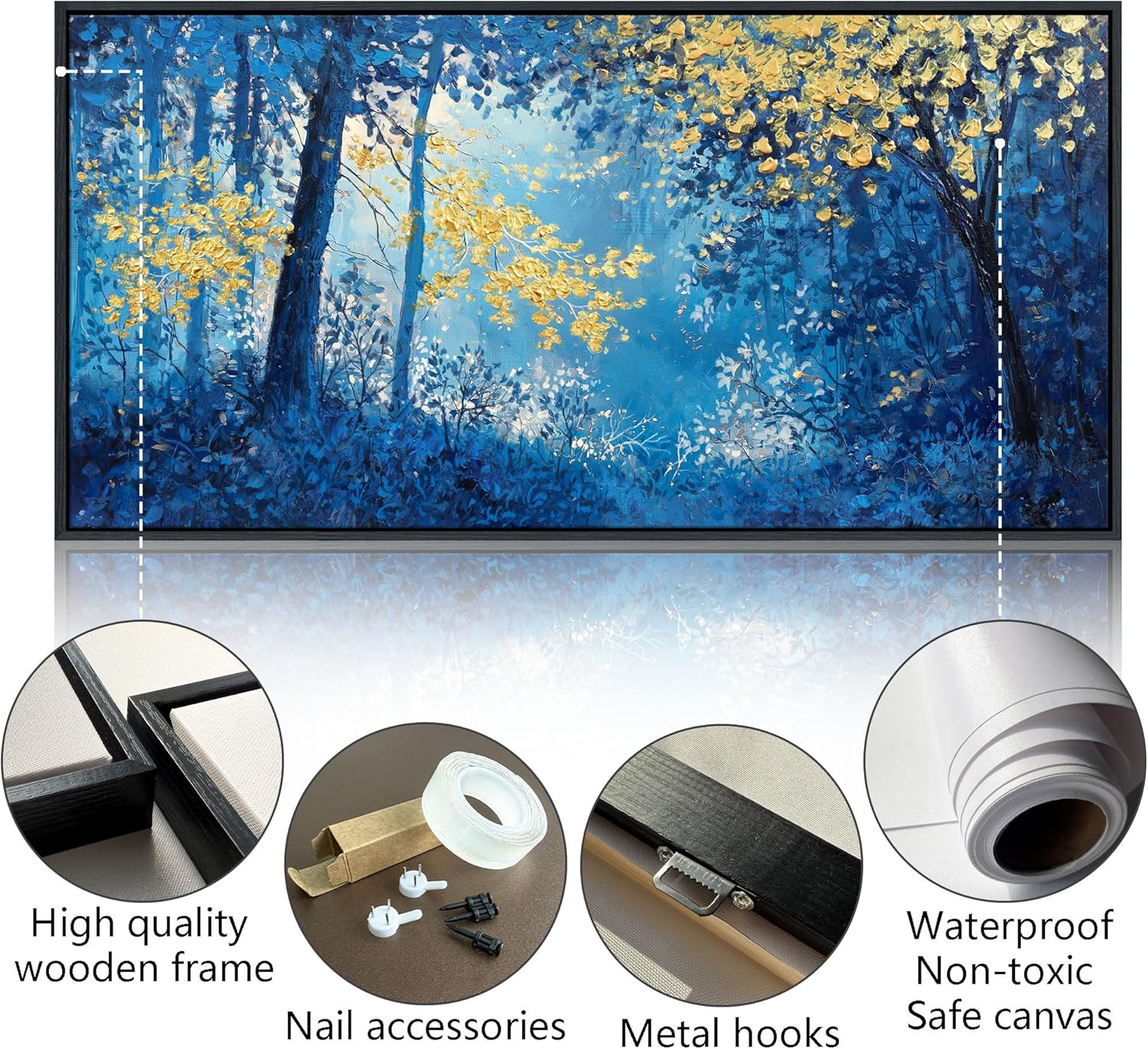 - Blue and Gold Canvas Wall Art Size:This 29×58 inches canvas wall art features a serene forest landscape with trees, blending blue and gold tones to create a modern yet timeless look for your living room, bedroom, or office.