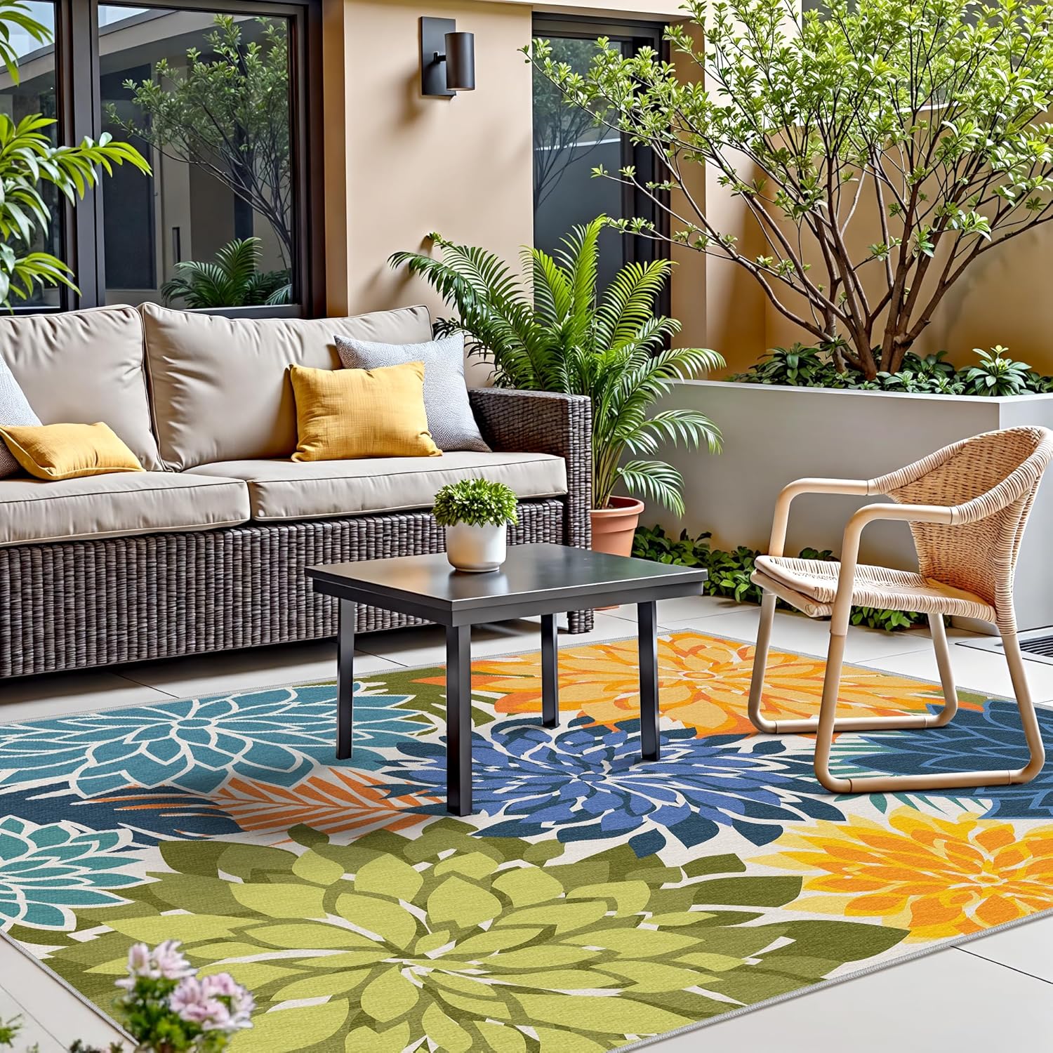 Indoor Outdoor Area Rug Washable Multicolored Patio Rug Tropical Botanical Modern Floral Indoor Outdoor Carpet Non Slip Yellow Green Rug Non Shedding for Patio, Deck, Backyard, Porch (5x8)