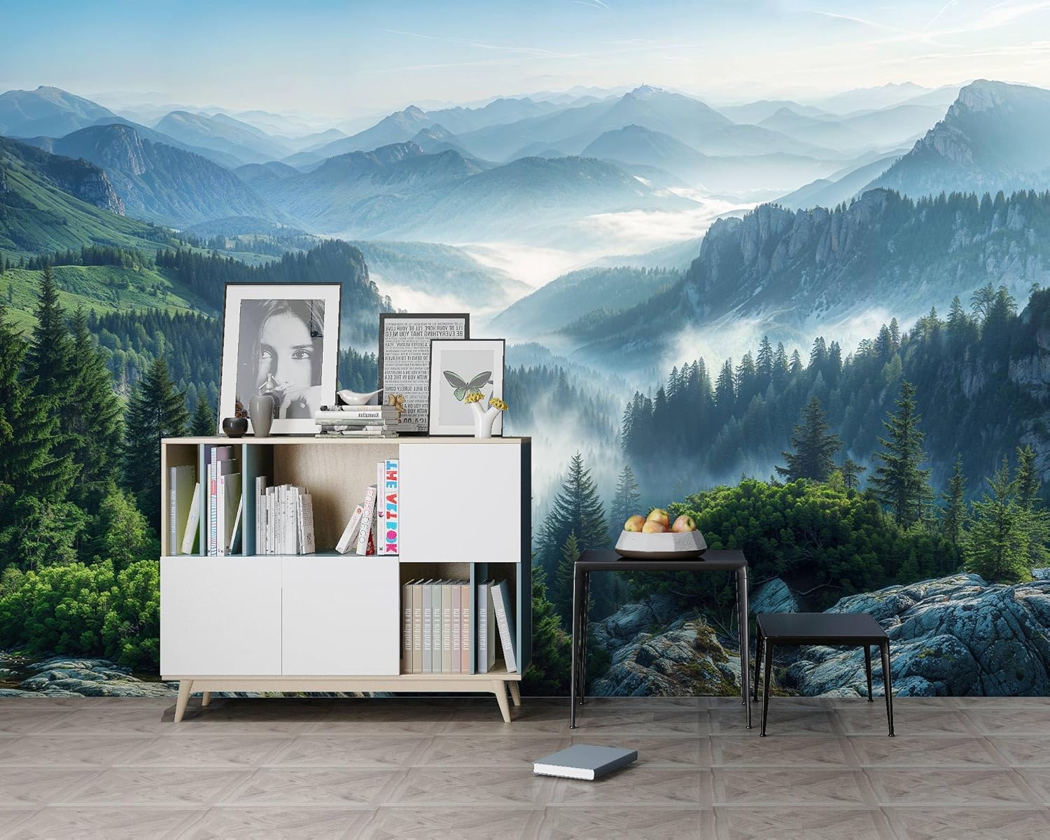 Misty Pine Forest Wallpaper Mountain Peaks Landscape Landscape Wall Mural (Not Peel and Stick)