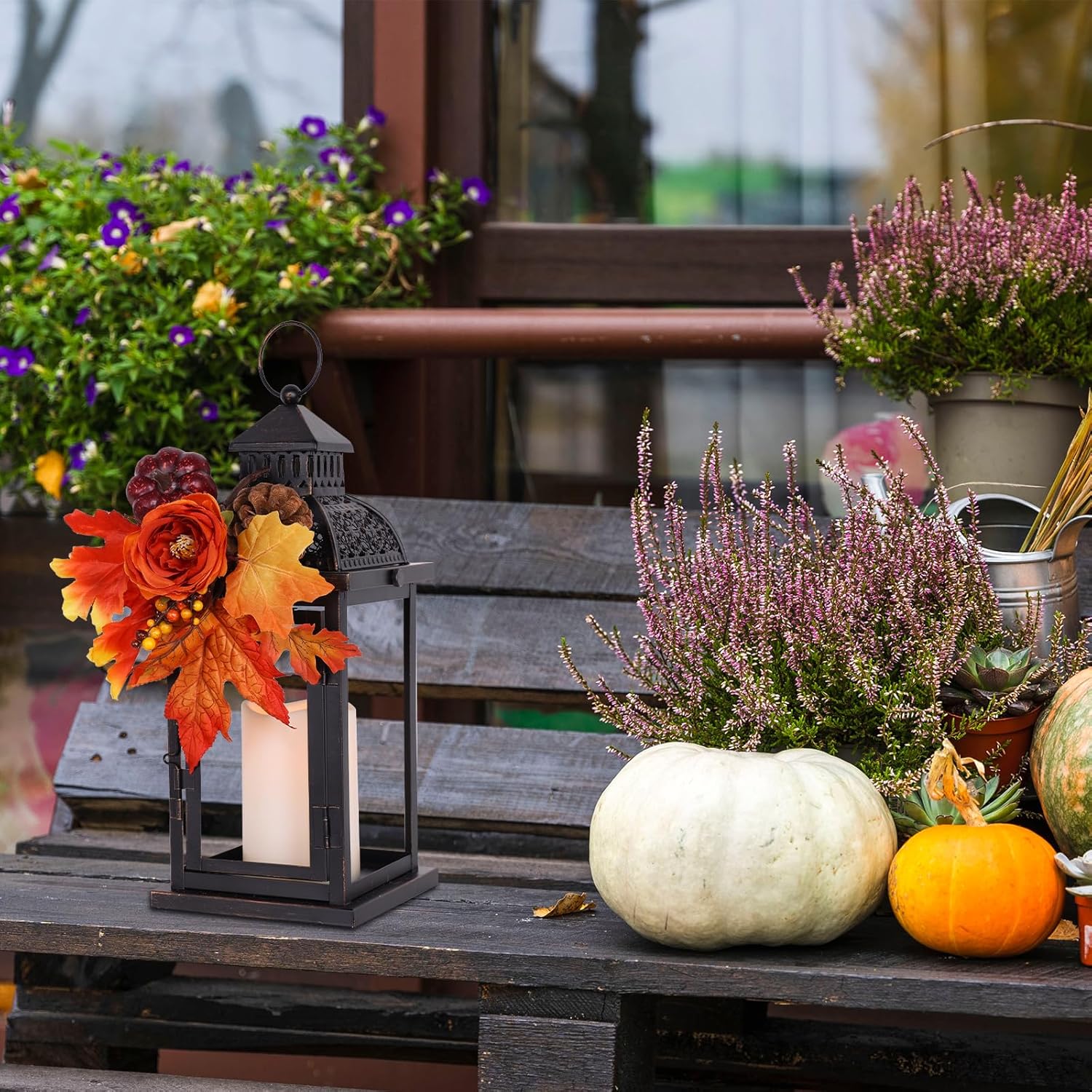 - ๐ใTHANKSGIVING DECORATIVE CANDLE LANTERNใ: NEEDOMO large square lanterns are hand painted with a distinguished, rustic metal finish effect, Black&copper metal features a distressed brushed look. Hollowed-out vintage design on the top adds a touch of classic beauty, creating an elegant appearance. The lantern attaches a Fall teardrop wreath with pumpkins, pine cones, berries.Turn on the LED candle to create an autumn atmosphere of gratitude and harvest, bringing warmth and good wishes to family and friends.