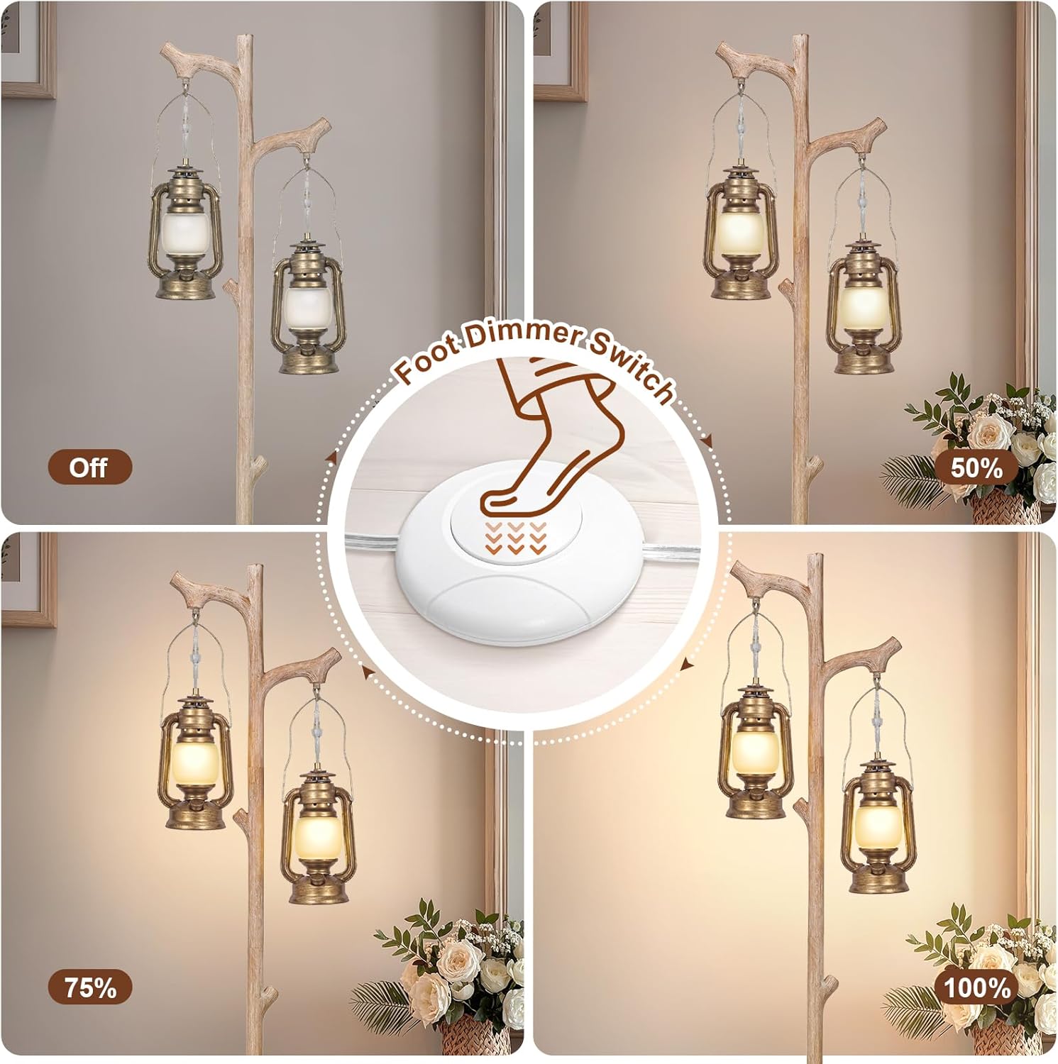 - FOOT SWITCH, DIMMABLE: Dimmable feature of foot switch corner floor lamp, 6.2ft plenty long enough cord, one click to control the ON or OFF switch, click more than 2 seconds that adjust the brightness from 0% to 100%, supper convenient. Dimmable floor lamp makes simple to create the perfect ambiance in any room